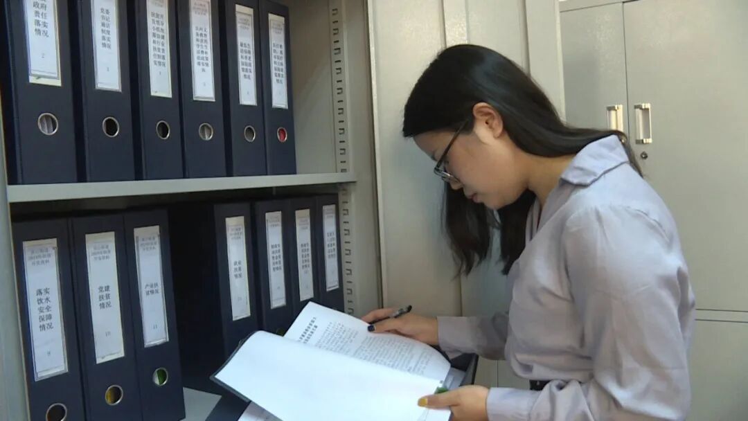 四会市贞山街道扶贫干部罗欣查阅资料。(来源:四会市融媒体中心供图)