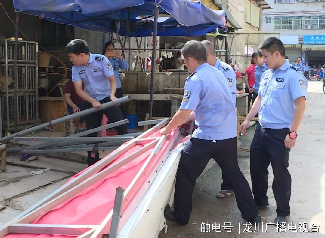 同时还对在龙川火车站临时市场周边违规搭建的伸缩帐篷、占道的大型广告招牌进行了拆除整治。