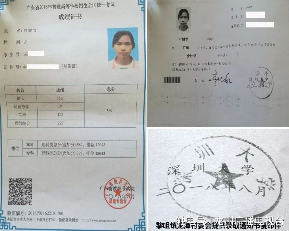 △贫困户叶新友女儿以总分589分的成绩被深圳大学录取,儿子以534分的成绩考入龙川一中高中部。