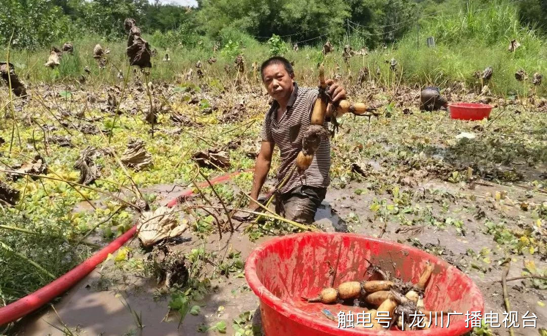 在黎咀镇龙潭莲藕产业基地内,田田荷叶下,深埋在淤泥里的一根根莲藕正等待着农户的采收,龙潭村这片40亩的莲藕已全面进入采收季节。
