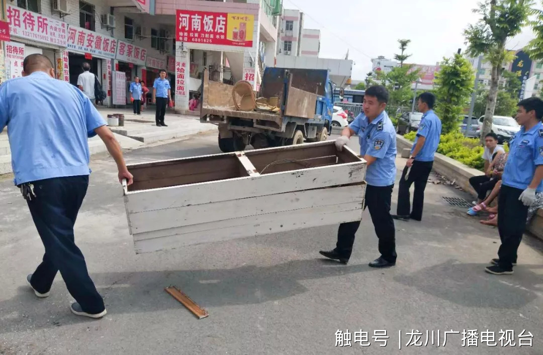 ∆ 城监大队清理火车站广场店铺门前的旧桌椅,石墩等杂物