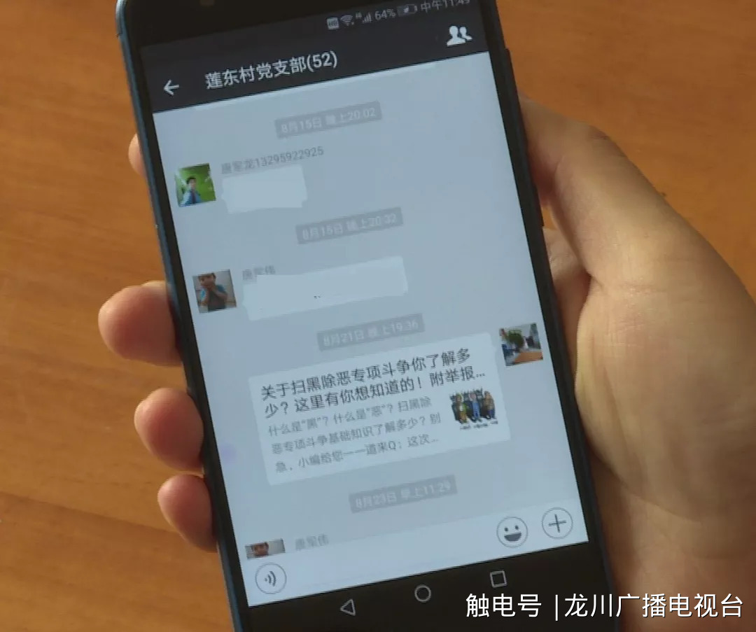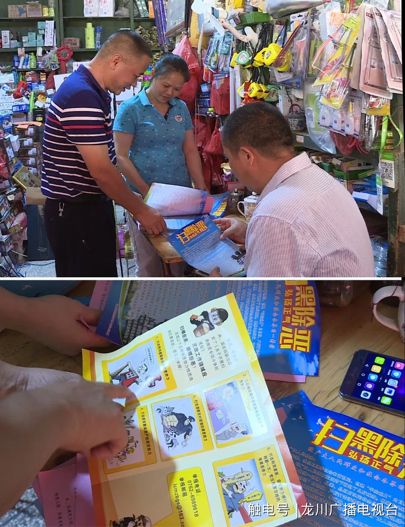 每周我们会定期下到村民家里开展扫黑除恶专项斗争宣传活动。在近段时间,我们在村文化广场白天、晚上滚动播放扫黑除恶专项斗争相关宣传视频,让村民们能够看得见、听得见。