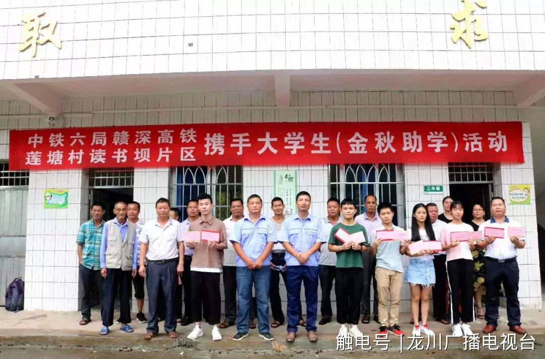 原来,自2017年11月初进场施工以来,中铁六局赣深高铁的建设者们便与高铁项目途经的党委政府、人民群众结下了深厚的友谊。尤其是今年,得知老隆镇莲塘村今年考上深圳大学、广州大学、广东技术师范学院等大学的6名贫困大学生还在为大学学费发愁的情况后,承担施工任务的中铁六局交通公司赣深项目部主动联系,将他们纳为助学对象,及时将8000元助学金送到贫困大学生的手中,解决了他们的燃眉之急,并勉励贫困学子要克服困难,努力学习,学业有成,载誉归来,回报家乡和社会。