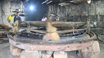 先将晾晒去壳后的油茶籽放入转盘槽,利用水车动力进行碾压,压成茶粉。