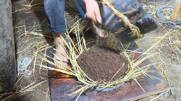 再将蒸好后的茶麸做成“茶麸饼”,先要用稻秆编制成秆网,把秆网放到地上,倒上蒸好的茶麸,将茶麸压成饼状。