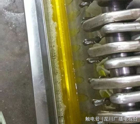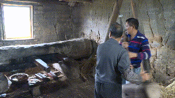 最后将“茶麸饼”放入特制的“木房”(木头挖空制成)里压榨,这个过程称为“打油”。两个师傅将悬空吊挂的“油锤”摇摆起来,大力撞击“木房”的压榨木条,在不断的撞击下,将茶饼中的茶油榨出来。