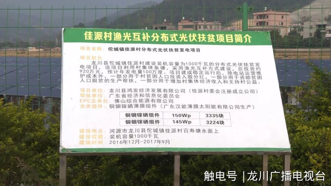 佗城镇佳派村是省定贫困村,省经信委驻村工作队根据佳派村现有产业发展特点,帮扶佳派村建设了总装机容量为1000千瓦的分布式光伏扶贫电站,以期通过光伏发电站的稳定收益,建立佳派村脱贫长效机制。项目总投资796.494万元、总装机1000千瓦、占地13332平方米(20亩),设计为“渔光互补”方式的综合利用模式。