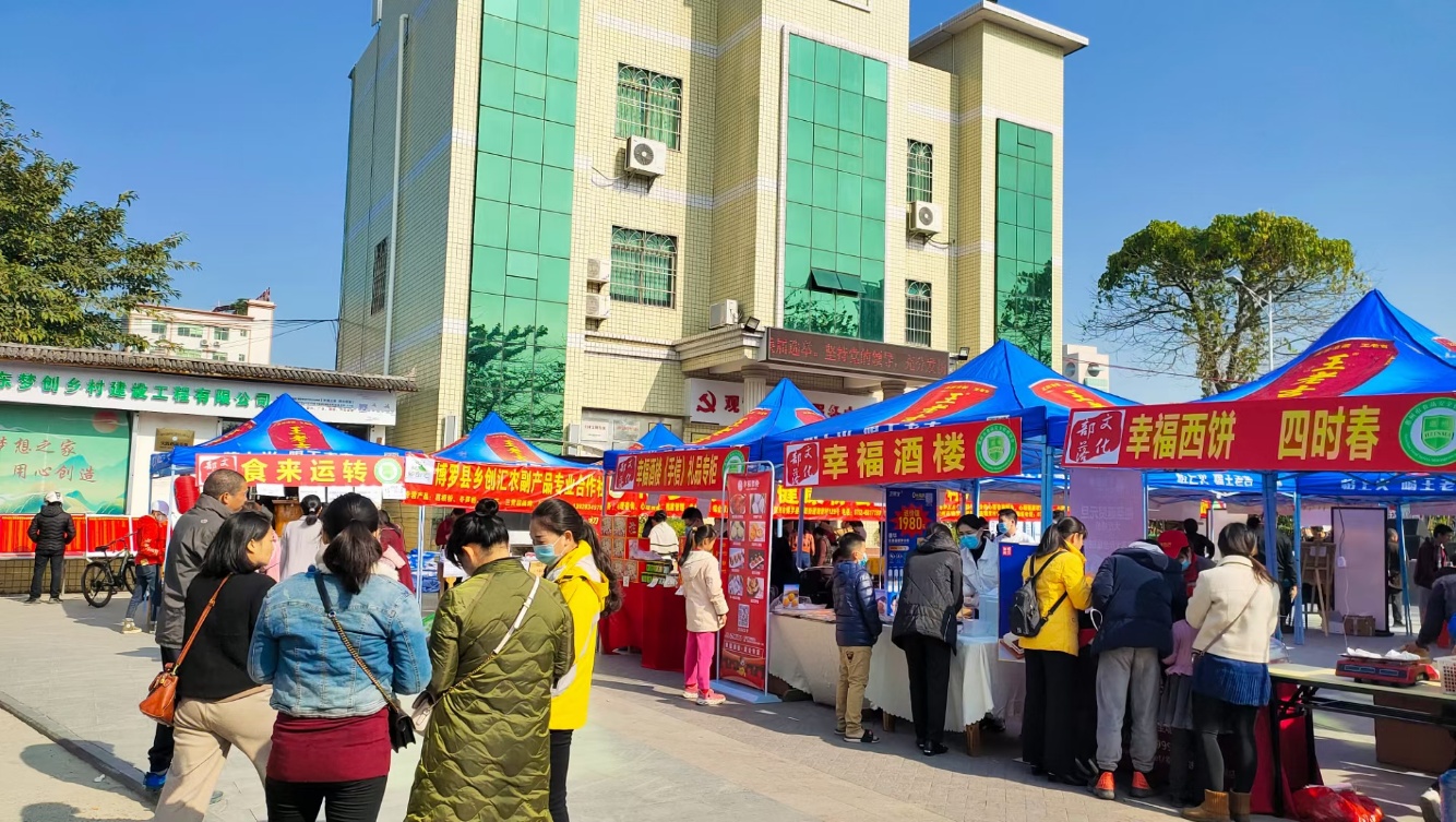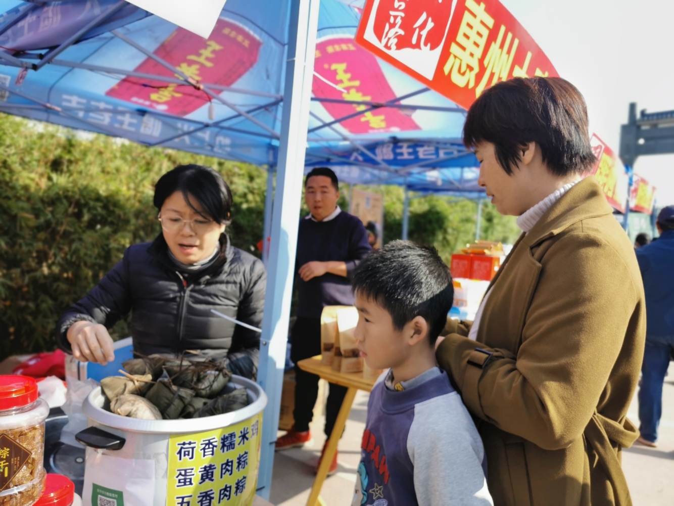 当天,罗阳街道观背村村委及牌坊前面热闹非凡,商家们早早就来到摊位布展,摆出各式美食、文创产品吸引市民的到来。在一家客家粽摊位前面,浓浓粽香随风四溢,不少市民驻足购买品尝。他家的客家特色粽干更是成为了市民围观的爆品。不仅如此,摊主还在现场直播包粽子,让更多人了解客家粽文化。摊主张雄军告诉记者:“这些都是老祖宗留下的非物质文化遗产,应该要发扬和传承下去。这个平台不错,和市民一起沟通,可以了解更多文化的东西。”