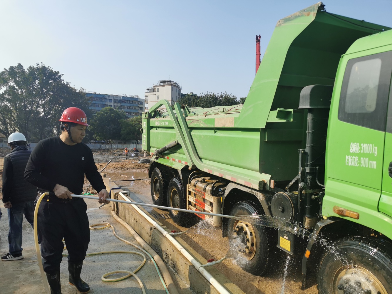 近日,记者在位于县城东北路的县老年大学综合大楼建设项目看到,施工现场的围挡周围都安装了喷雾装置,不停地在喷洒水雾;每一台从工地出来的车辆都必须在出口大门的水槽处把轮胎和车身上的泥土清理干净后,方可放行。