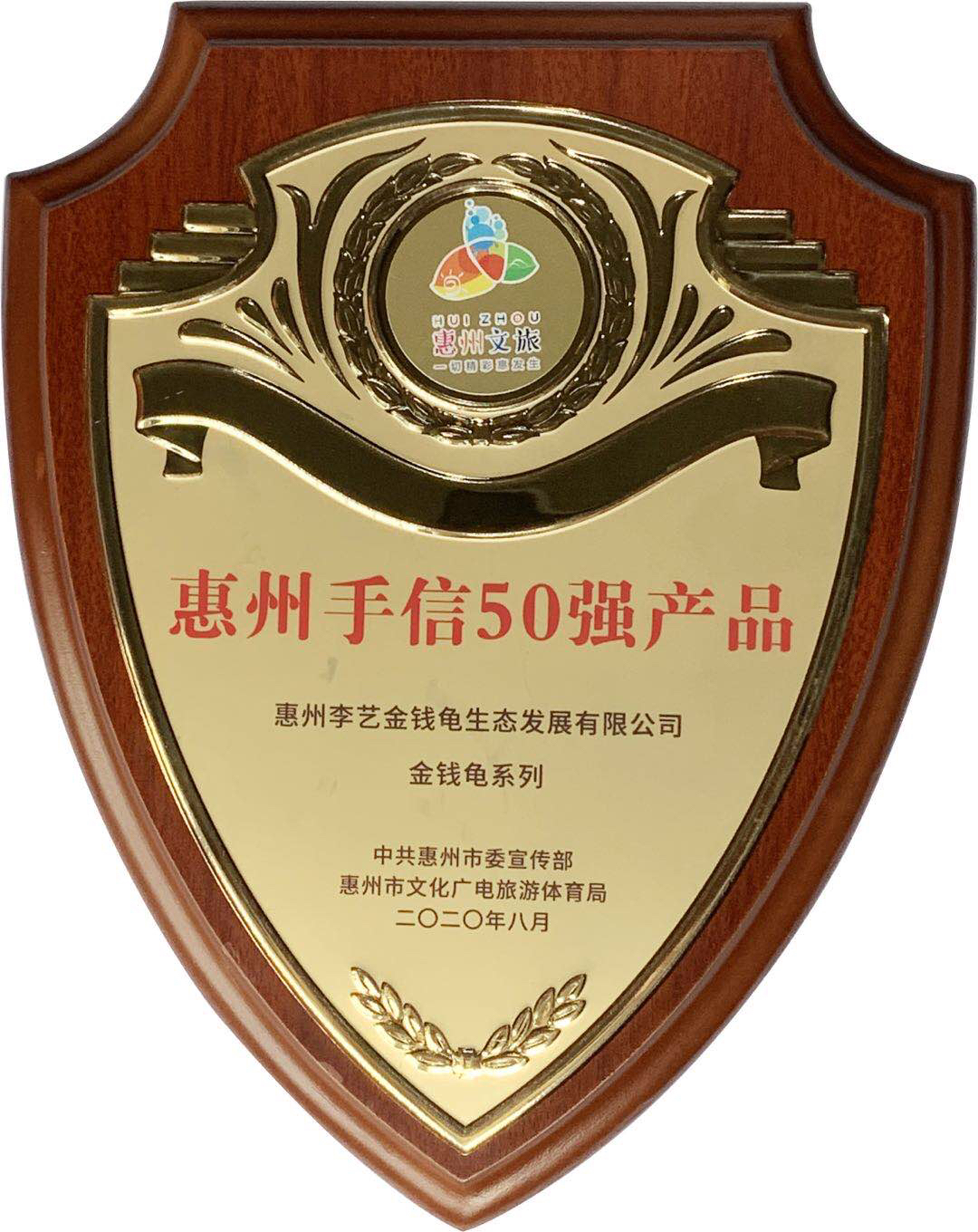 “岭东雄郡 惠州有礼”惠州手信评选活动历时近3个月,近400种产品参评,超100万市民和游客关注。在入围的50强产品中,博罗县杨侨镇惠州李艺金钱龟生态发展有限公司的金钱龟酒和金龟露以第四名的成绩交出了完美答卷。