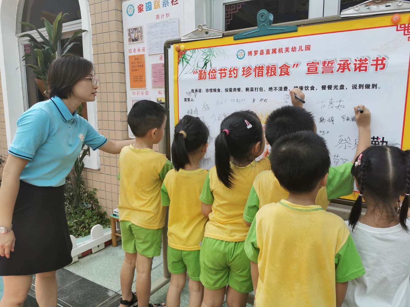 “我承诺珍惜粮食,按需用餐,剩菜打包,绝不浪费,健康饮食,餐餐光盘,说到做到。“9月10日上午,一群稚嫩的声音在县直属机关幼儿园响起,走进一看,原来是孩子们在老师的带领下进行”勤俭节约 珍惜粮食“宣誓暨签名活动。