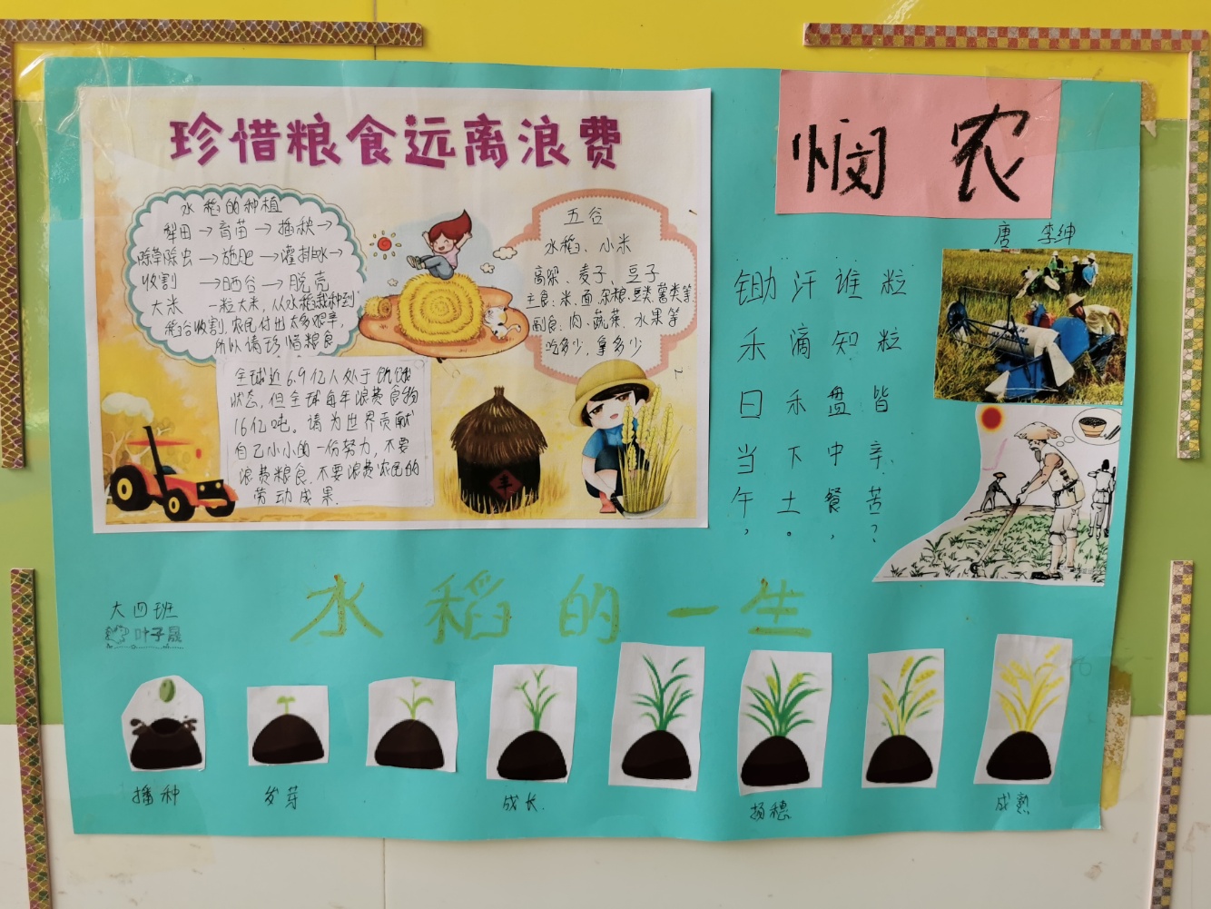 “谁知盘中餐,粒粒皆辛苦。”据介绍,幼儿教师不仅利用古诗词、视频、图片、绘本故事等教学形式,形象生动介绍农民伯伯种粮的艰辛和不易,以及稻谷变为馒头、包子、米饭的历程,了解各类蔬菜的成长过程,由此将勤俭节约的种子植入孩子们心中。