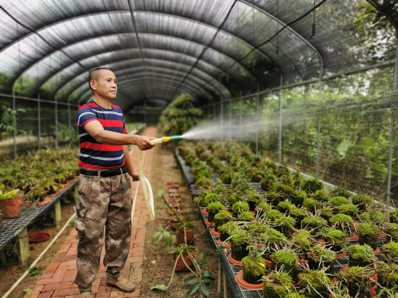 石斛本是野生植物,寄生于树木之上,想要种好并非易事。“隔行如隔山”,董购良虽是门外汉,但他更是有心人,为了种好铁皮石斛,董购良一方面深入云南、广西等地通过自学摸索出石斛的生长习性,一方面向各地石斛种植专家取经,还经常参加国家、省、市、院校等举办的各类培训班充电。通过几年的管理实践,董购良慢慢掌握了石斛的种植技术,成为了一名石斛规模化种植能手。