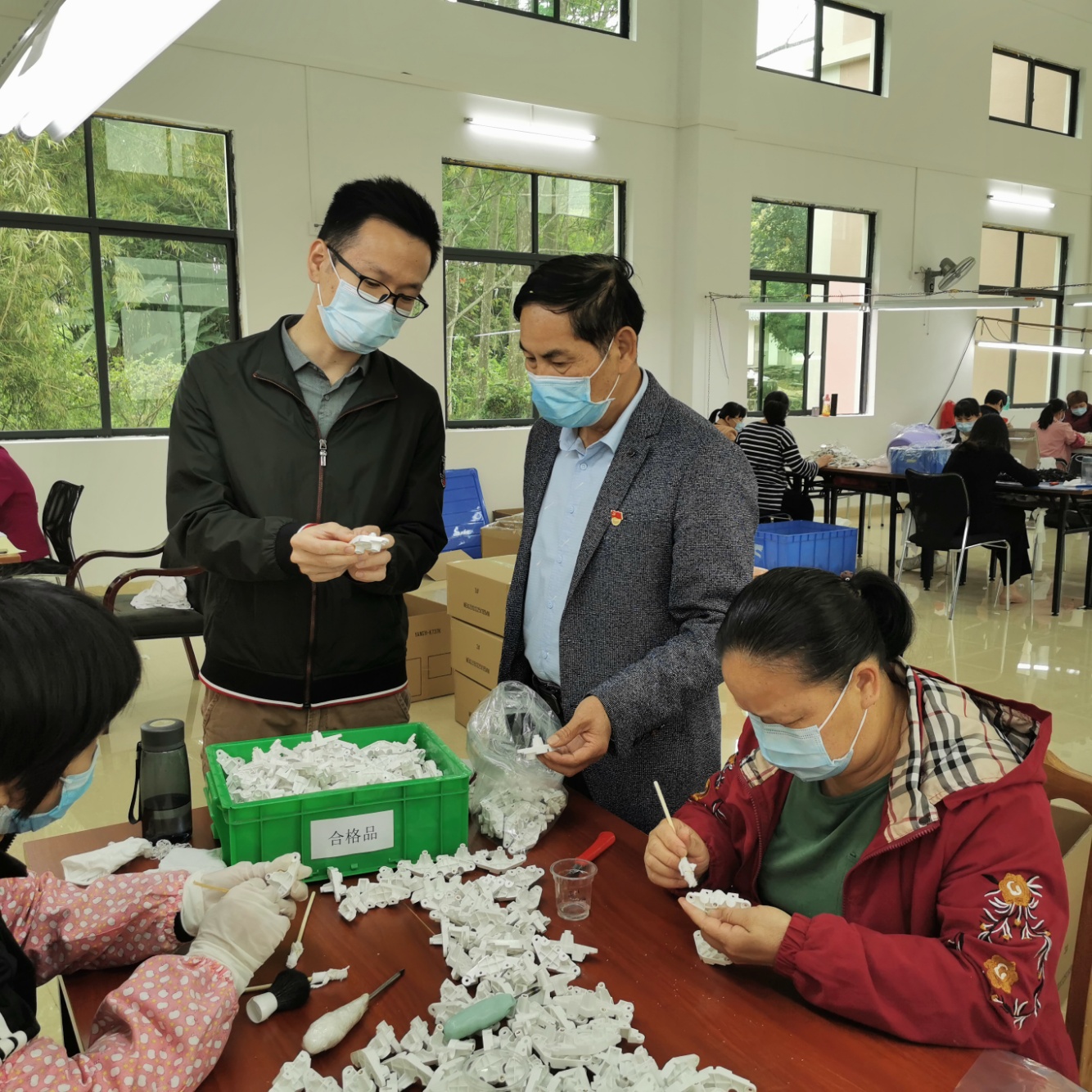 三水村村委会副主任陈天容在龙溪经营一家模具注塑厂。疫情期间,为缓解部分无法外出村民的就业压力,在帮扶单位的积极动员鼓励下,他把厂内部分外包业务放回村里,3月12号由村委会旧址、废旧礼堂改造成的爱心帮扶车间正式投入生产,有近30名村民到该车间从事塑胶制品组装工作,每人每天能拿到100元工钱。