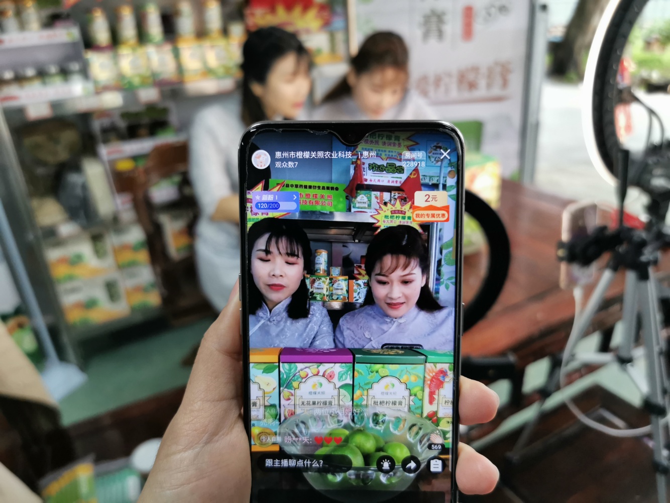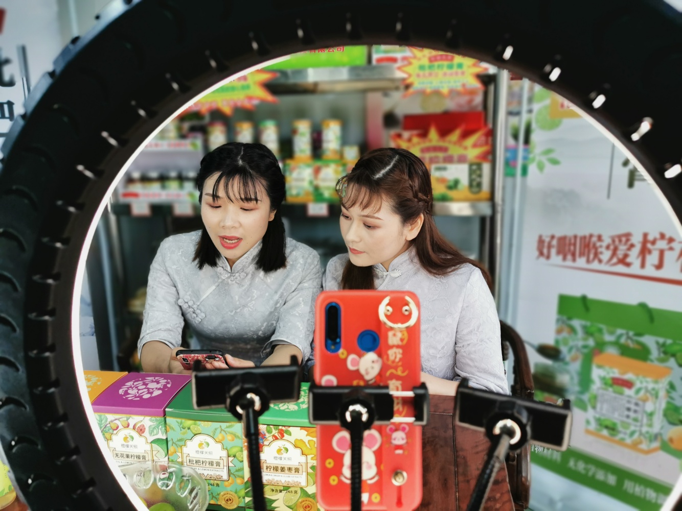 4月3日,博罗县公庄镇举行农特产品直播特卖活动,两名女村干部化身女主播在线上与网友热情互动,积极推介当地特色农产品,为家乡商品“打call”。