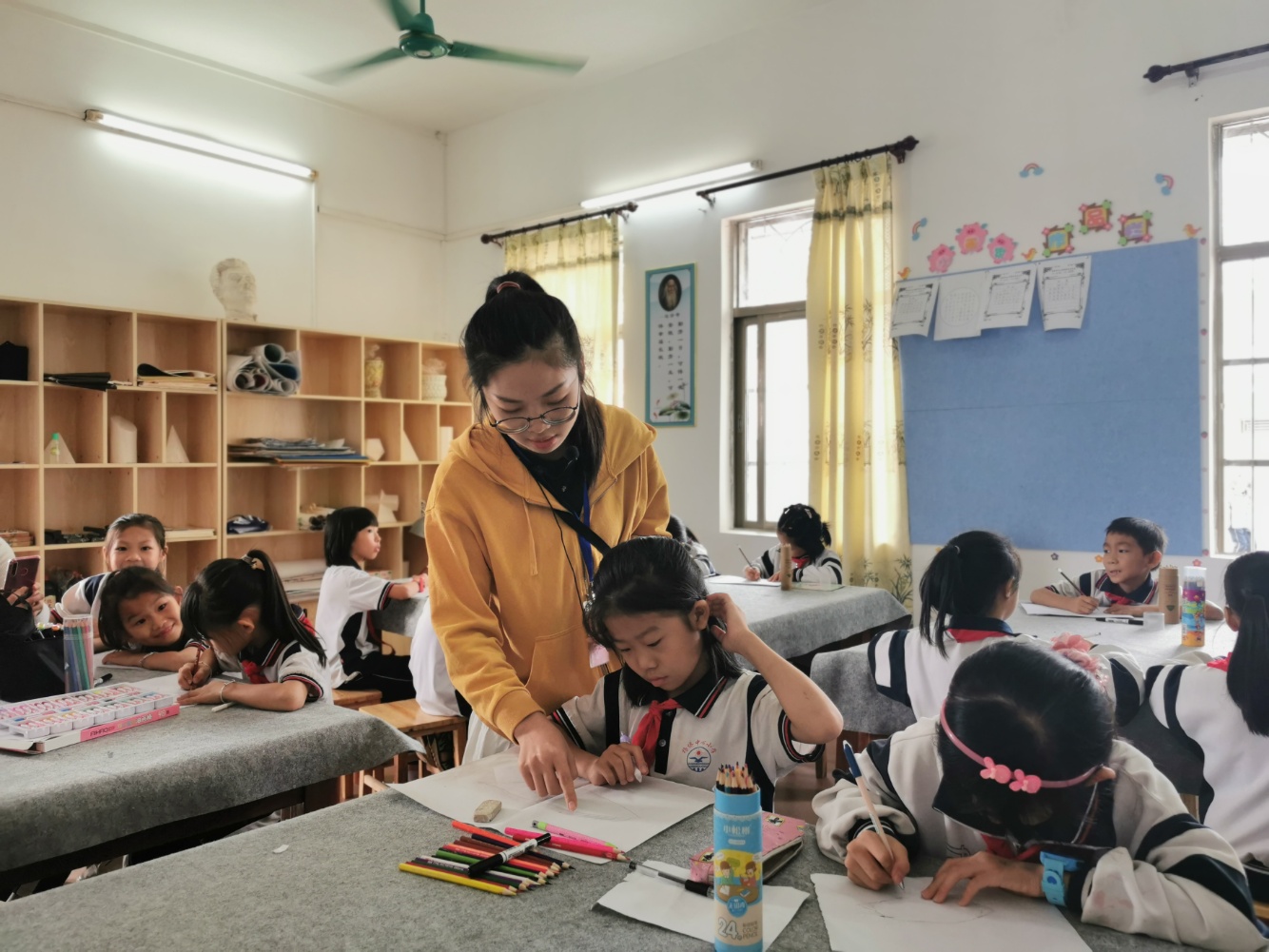 不单单是音乐课程,现在农村的学生们也能接受到专业的美术和体育教育,而这得益于教育局的优惠政策。今年初开始,县教育局对全县城乡教育进行了调研排查,发现群众对城乡音美体教育发展不平衡、农村孩子音美体教育薄弱等问题反映强烈,对改善农村孩子艺体教育有较高期望。为此,今年博罗县新增财政投入近2000万元,统筹44个编制内教师,并新增216多个合同制教师名额,专项招聘大专以上学历的音美体教师,经过层层考核,最终选聘260名教师充实到农村小学。杨侨中心小学美术老师曾锦慧就是其中一员。