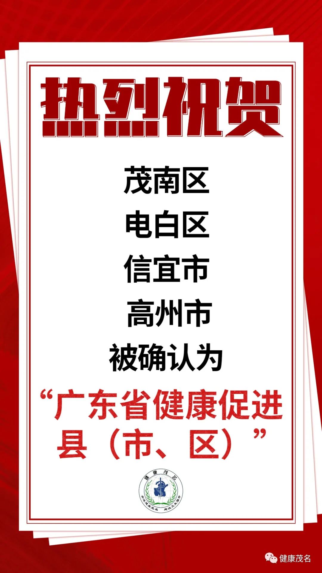 广东省卫生健康委公布了2020年度省级健康促进县(市、区)技术评估结果,其中茂名市茂南区、电白区、信宜市、高州市被确认为“广东省健康促进县(市、区)”。