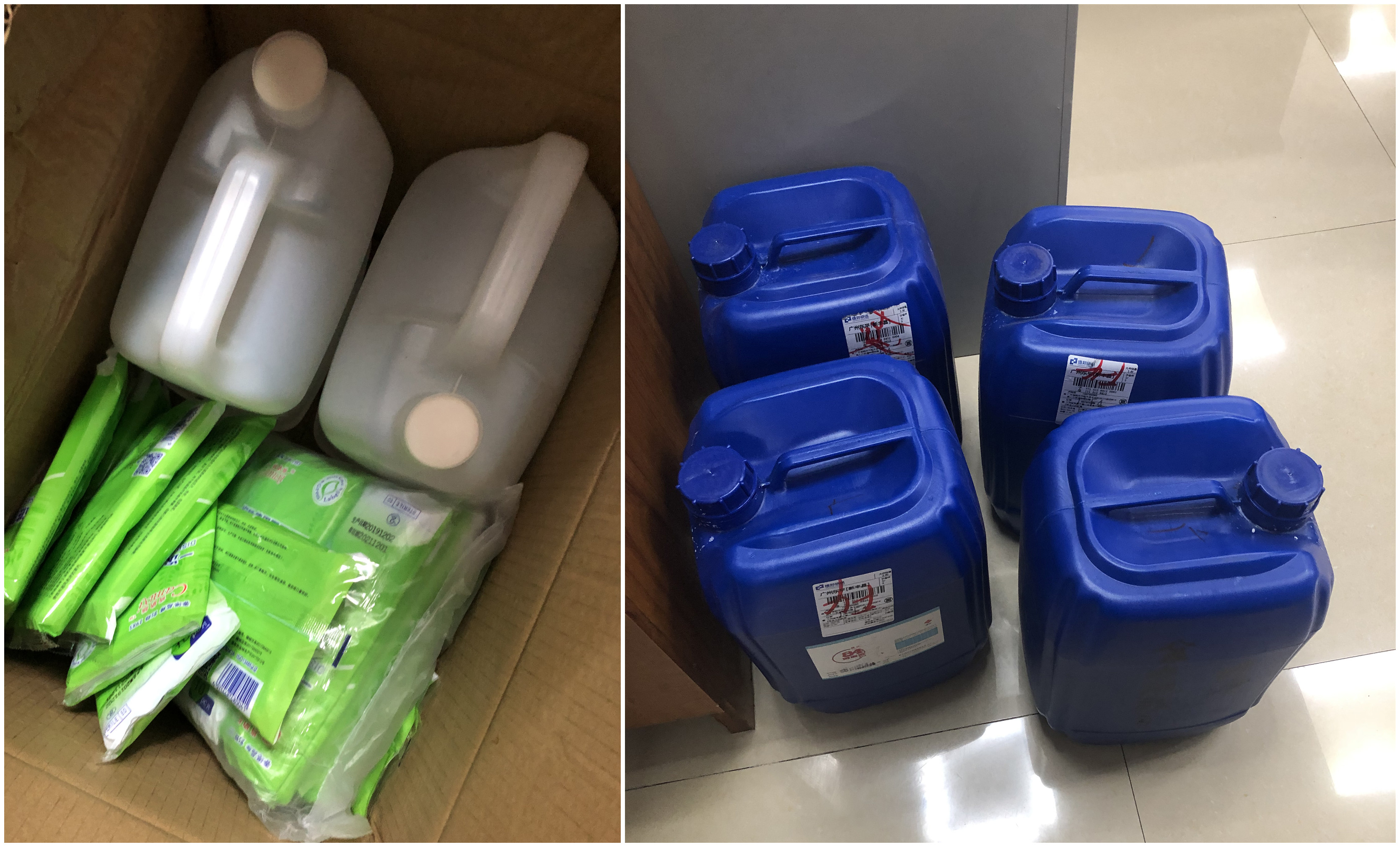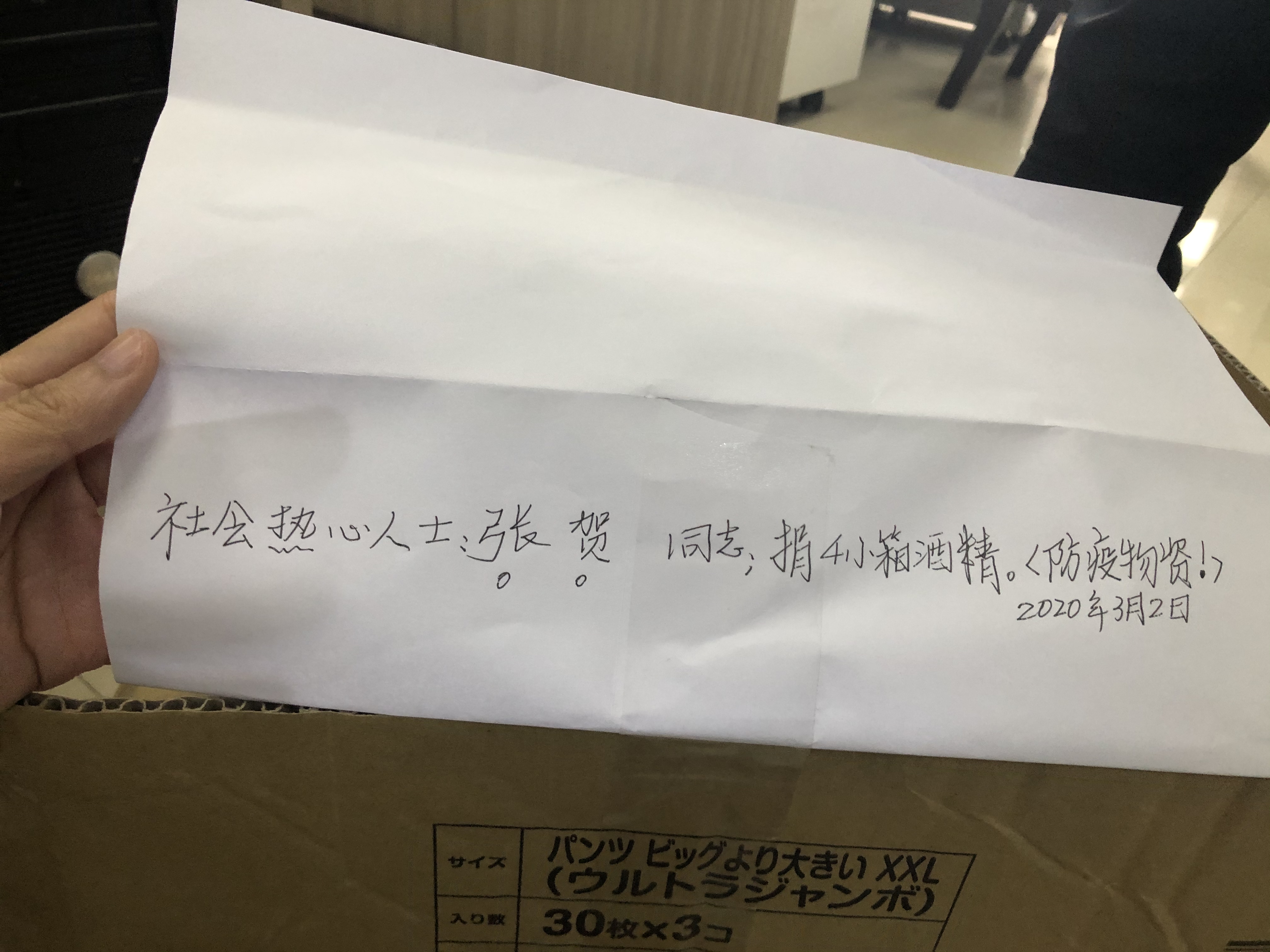 3月2日,爱心人士张贺捐赠酒精4小箱。