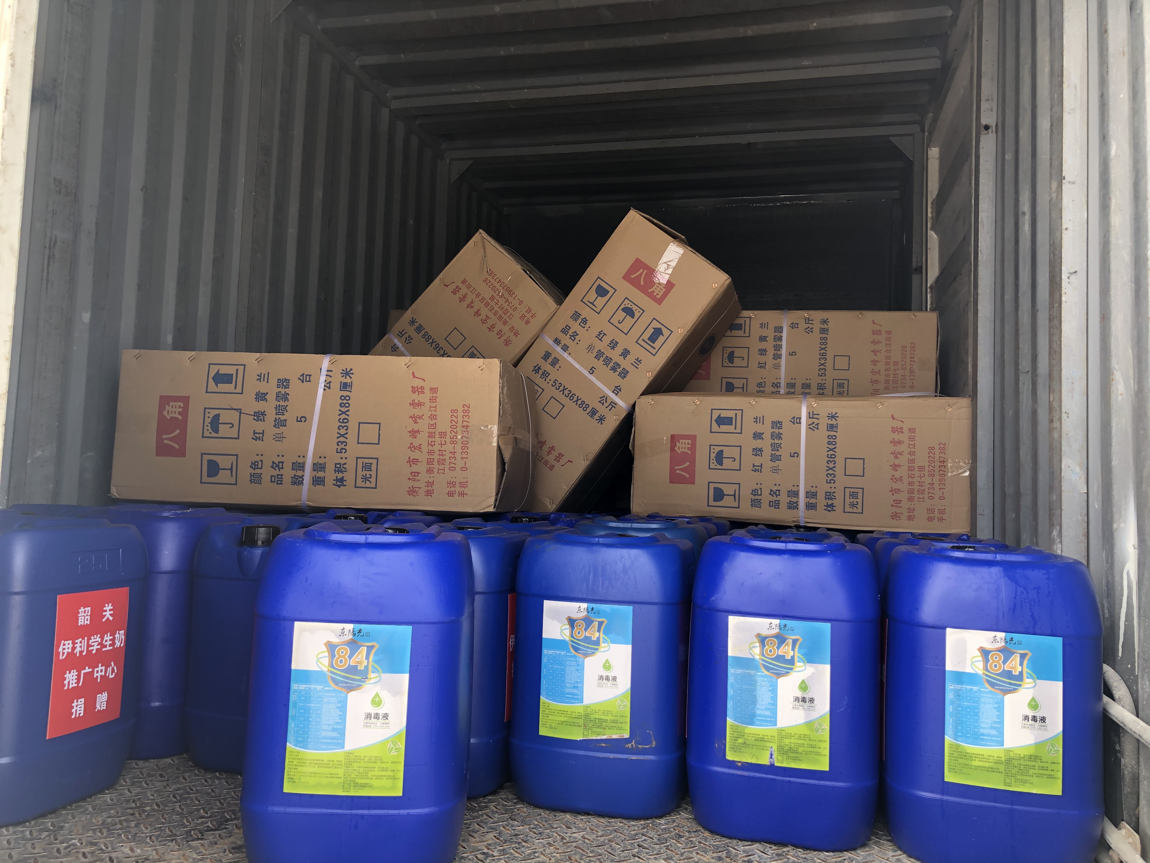 3月5日,伊利学生饮用奶(韶关)推广中心捐赠84消毒液80桶、 背负式手动消毒喷雾器80个(韶关市教育局下拨)。
