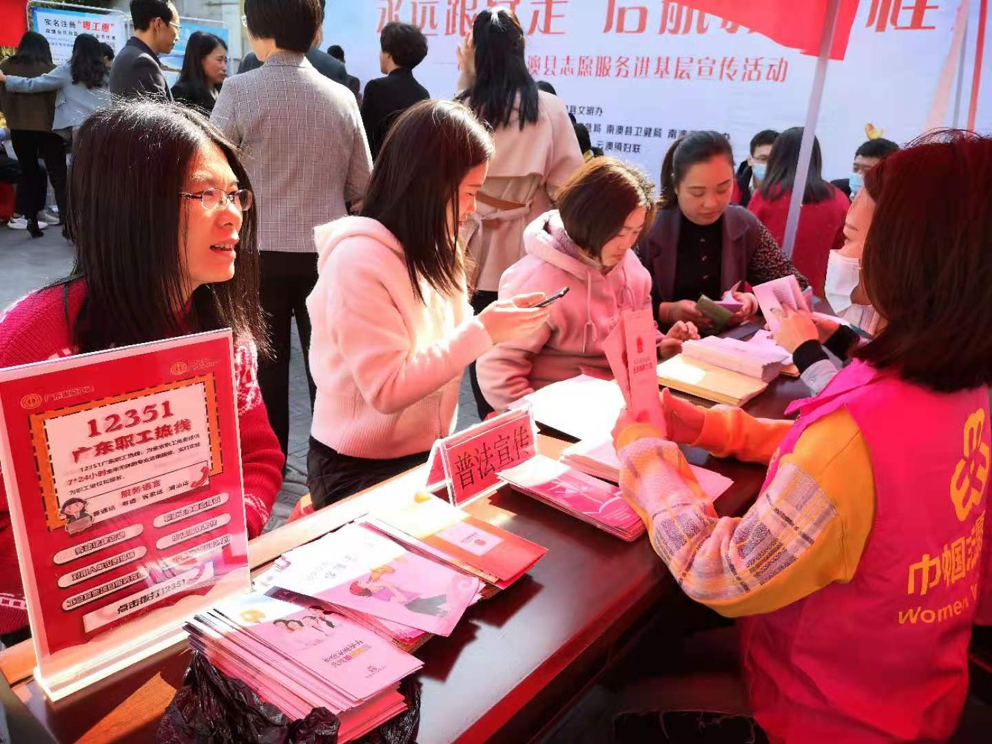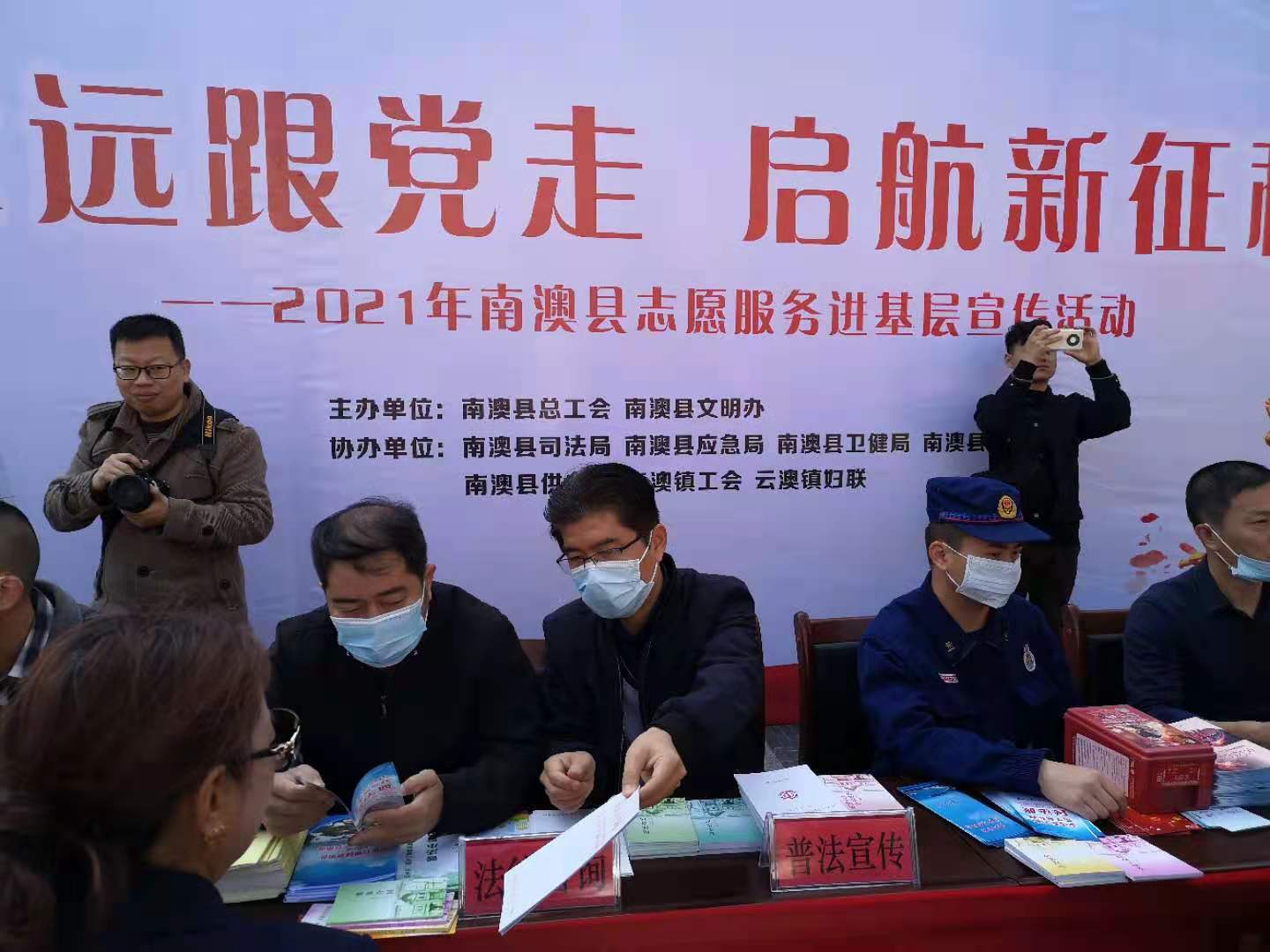 3月26日上午,位于南澳县云澳镇影剧院前的小广场人头攒动。由县总工会、县文明办主办,县司法局、县应急管理局、县卫健局、县禁毒办、供电局和云澳镇工会、镇妇联等部门联合承办的“永远跟党走 启航新征程”2021年南澳县志愿服务进基层宣传活动在云澳镇中柱村举办。县领导黄淑华、黄卫丹和县总工会、云澳镇领导等参加活动,活动还吸引大批群众参与其中。