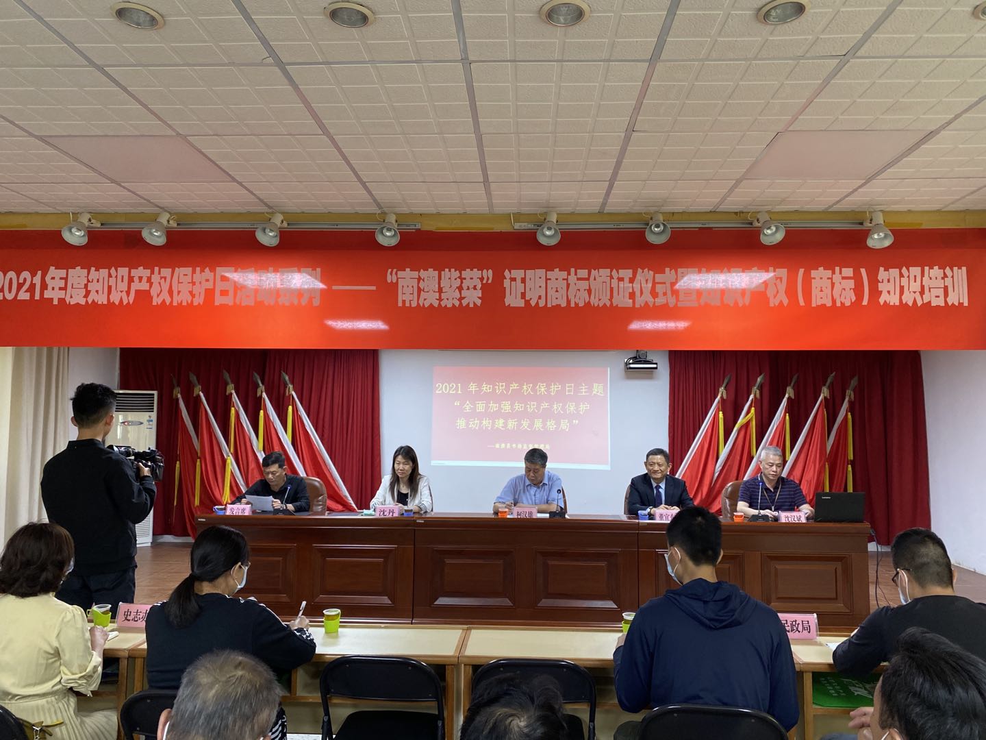 为加大知识产权运用促进和宣传工作力度,进一步提高知识产权质量效益,推进南澳知识产权工作迈上新台阶。4月20日下午,南澳县市场监管局因地制宜结合区域特色,组织开展“南澳紫菜”证明商标颁证仪式暨知识产权(商标)知识培训活动。本次活动以“全面加强知识产权保护 推动构建新发展格局”为主题,邀请县商标品牌工作领导小组成员单位、各镇(管委)及企业协会代表参加。