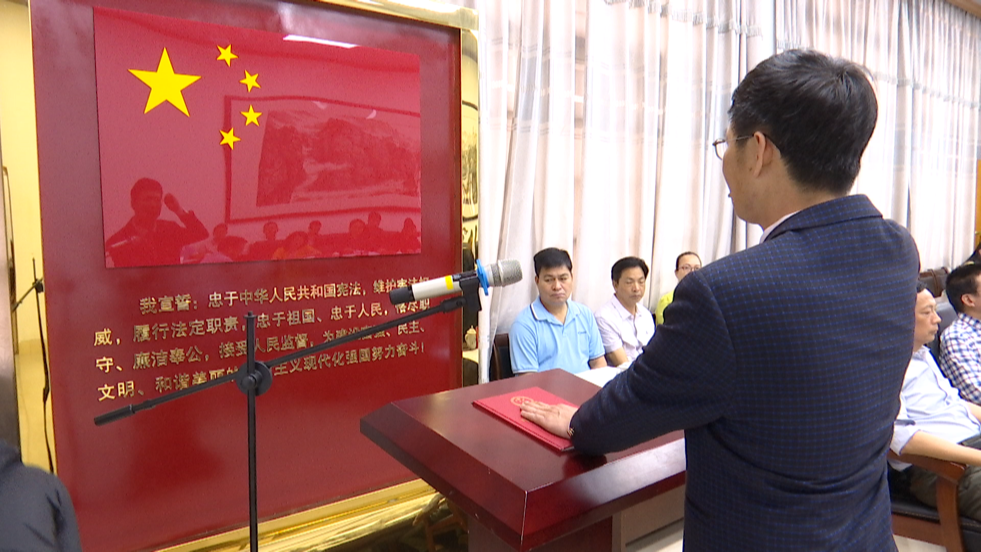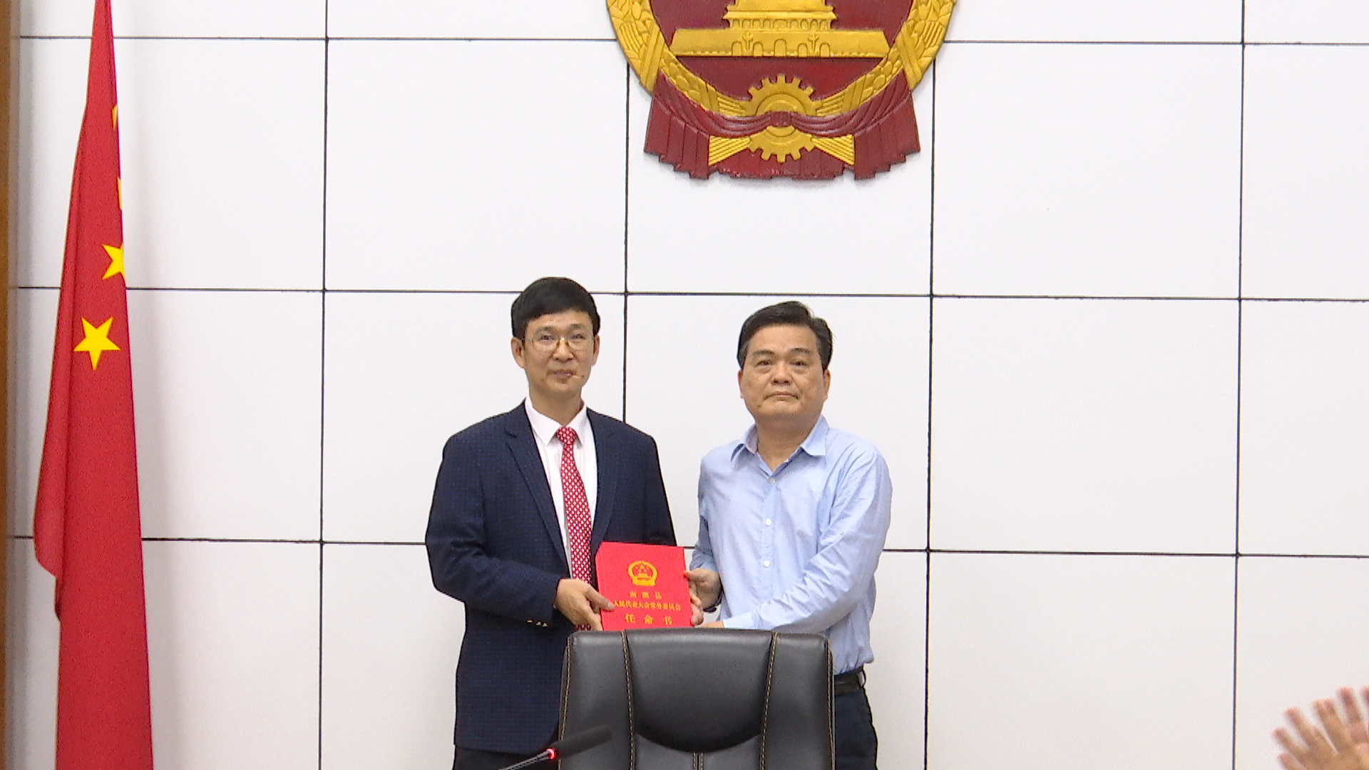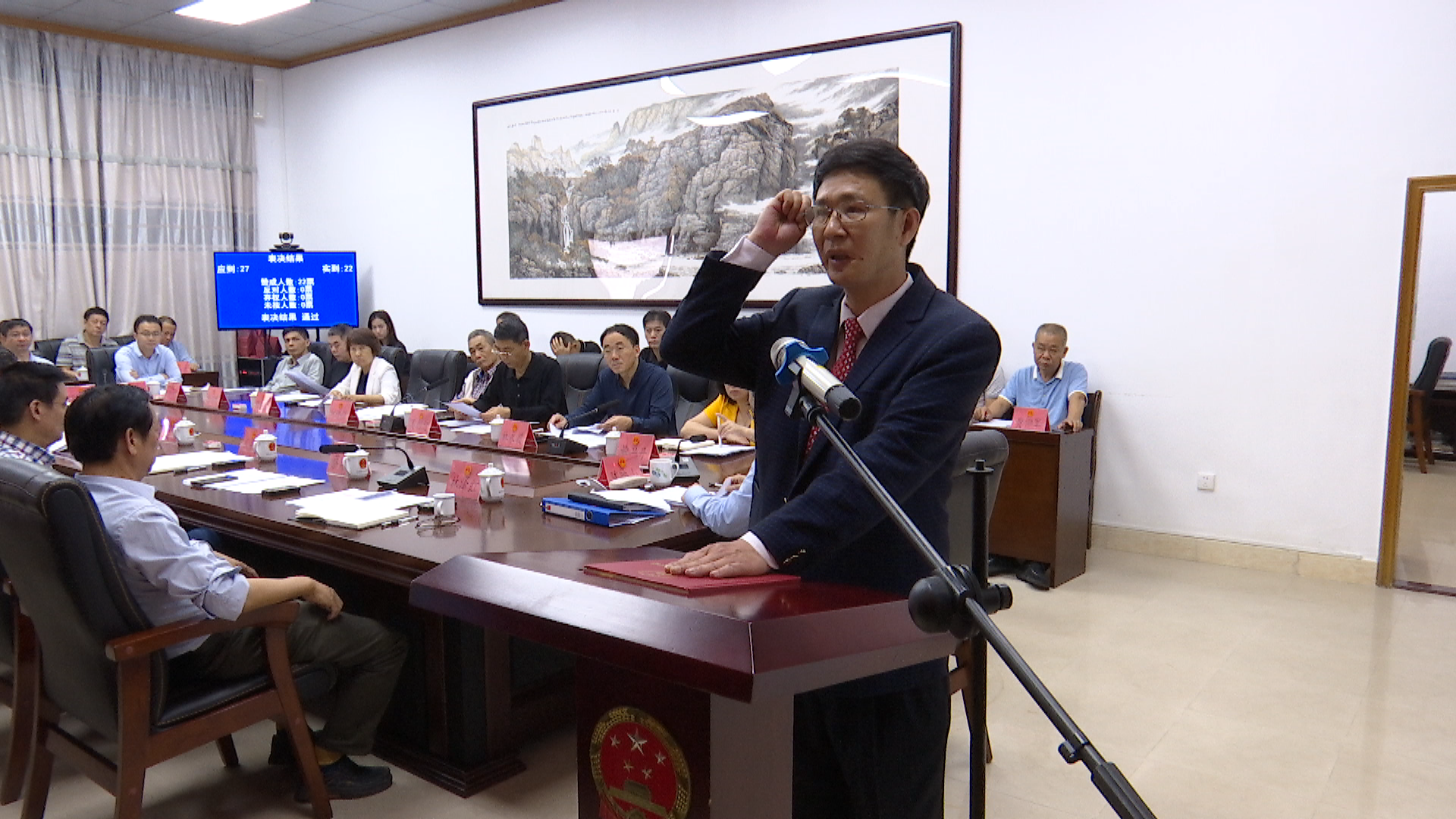 会议审议通过了有关人员任命事项。县人大常委会主任陈映山代表县人大常委会向新任命的人员颁发任命书。新任命人员在县人大常委会组成人员的见证下,面向国旗、手按宪法进行庄严宣誓。