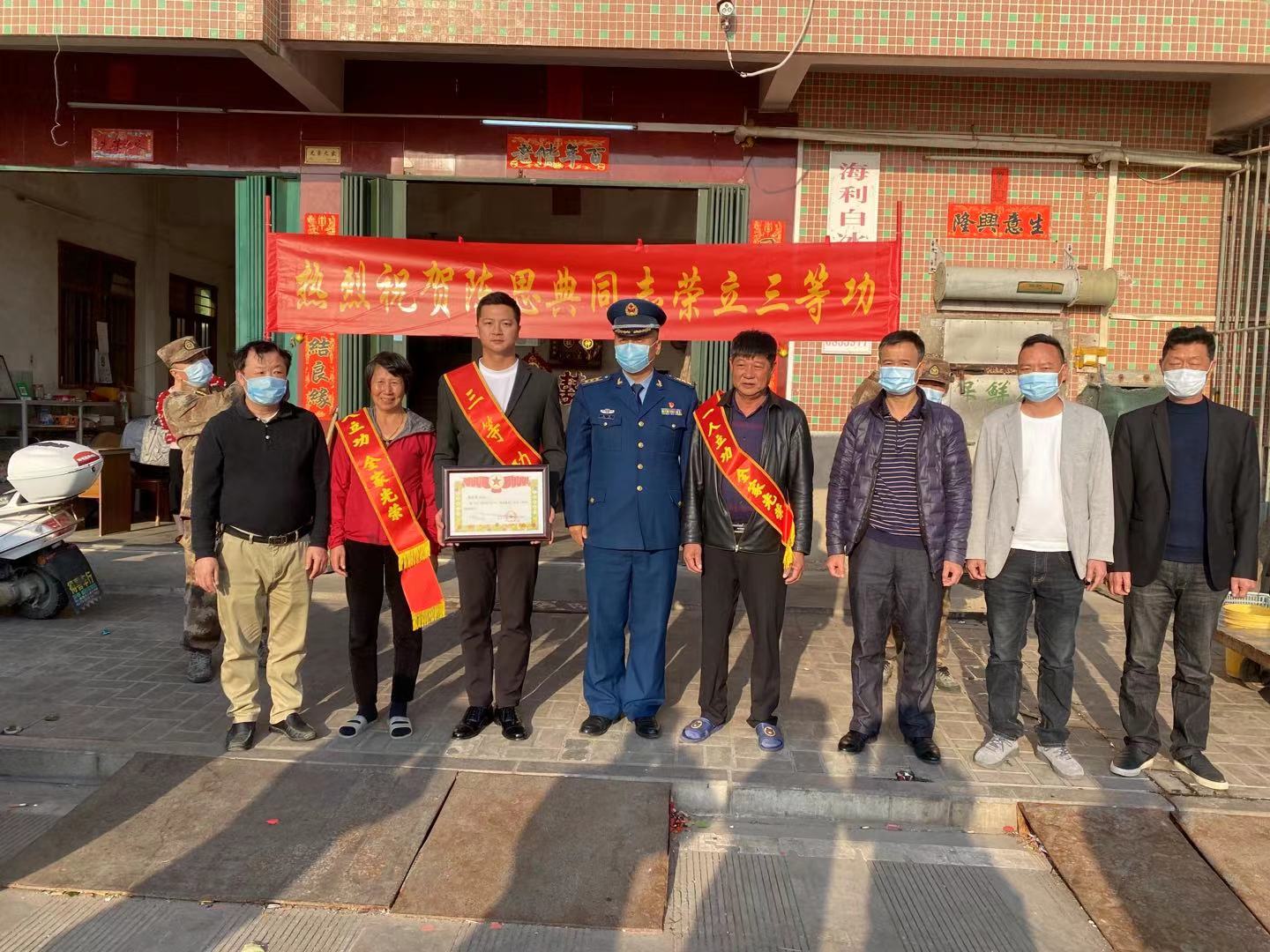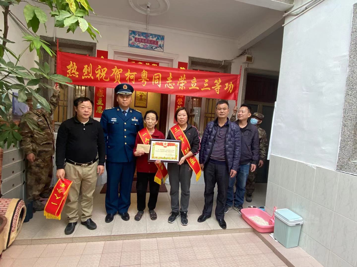 “一人立功,全家光荣”。县人武部、县退役军人局拉着大红条幅,敲锣打鼓来到荣立三等功的优秀现役军人柯粤、陈思典家中,为他们送去喜报,让邻里乡亲共同见证这一荣耀时刻。