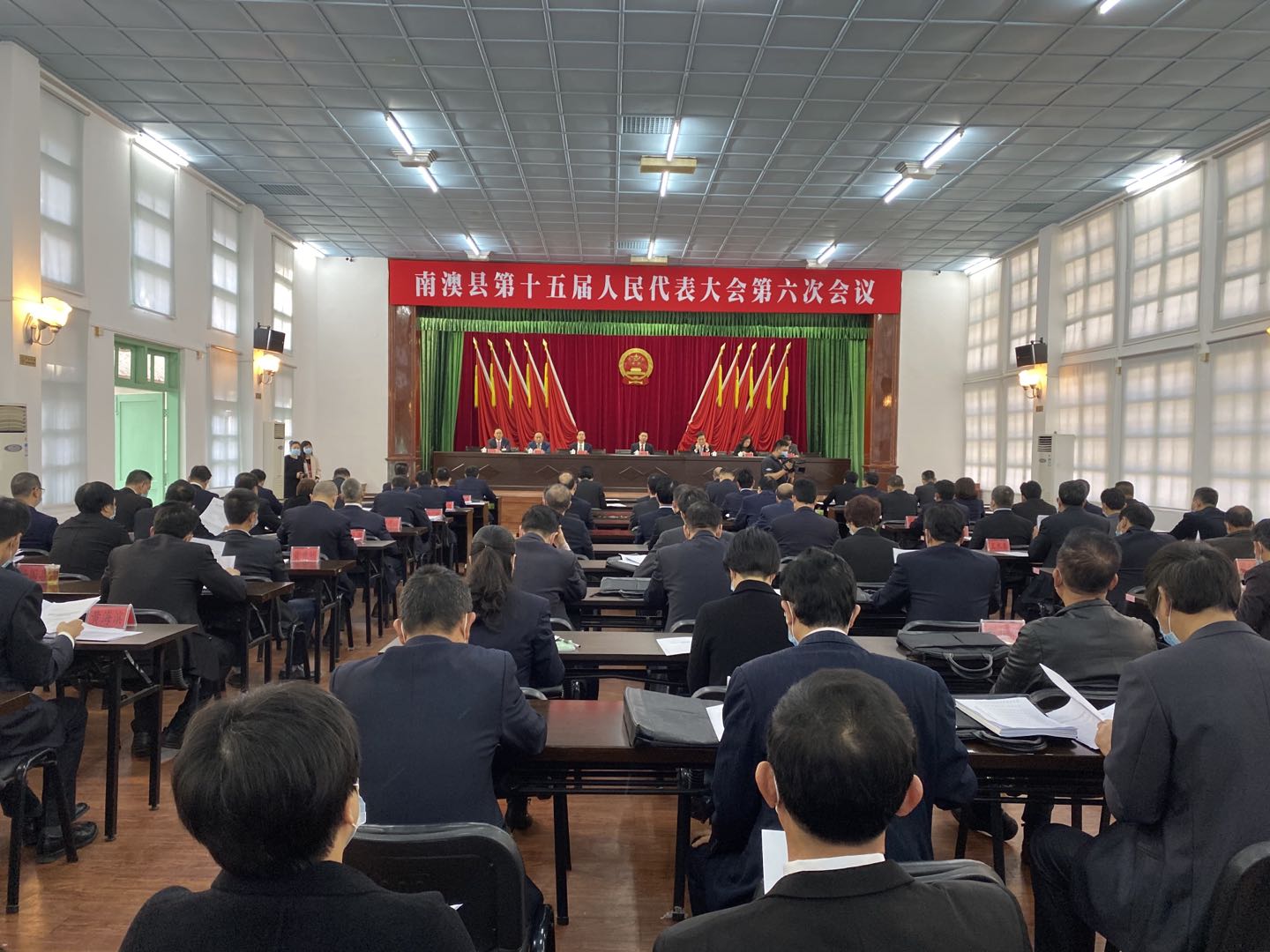2月3日下午,南澳县第十五届人民代表大会第六次会议在县礼堂举行预备会议。南澳县委书记柯茂、县人大常委会主任陈映山、县人大常委会副主任林泽红、黄卫丹、蔡利逊、蔡奕生、林永毅出席会议并在主席台上就座。会议由陈映山主持。