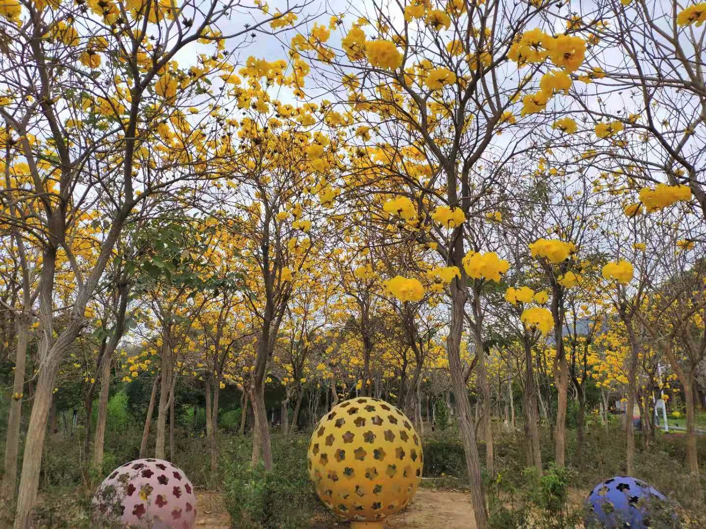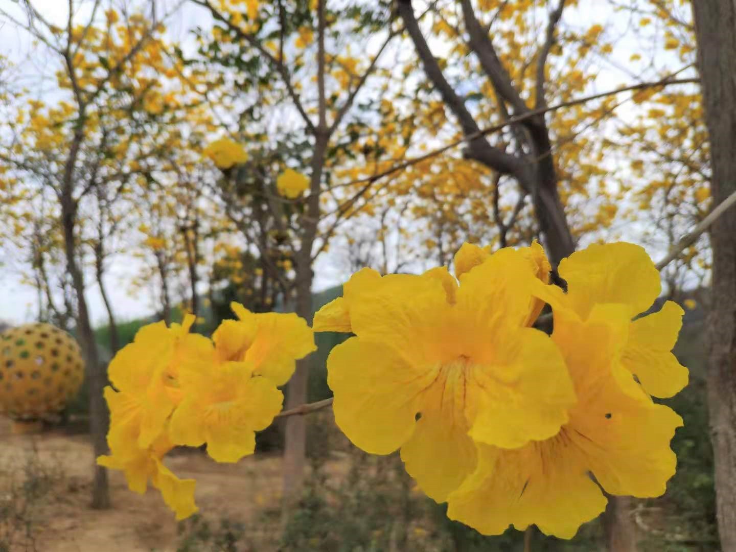 据了解,黄花风铃木因花冠呈漏斗形、形似风铃而得名,是一种会随着四季变化而更换风貌的树。春天枝条叶疏,清明节前后会开漂亮的黄花。夏天长叶结果荚,秋天枝叶繁盛,冬天枯枝落叶,四季呈现出不同的美。