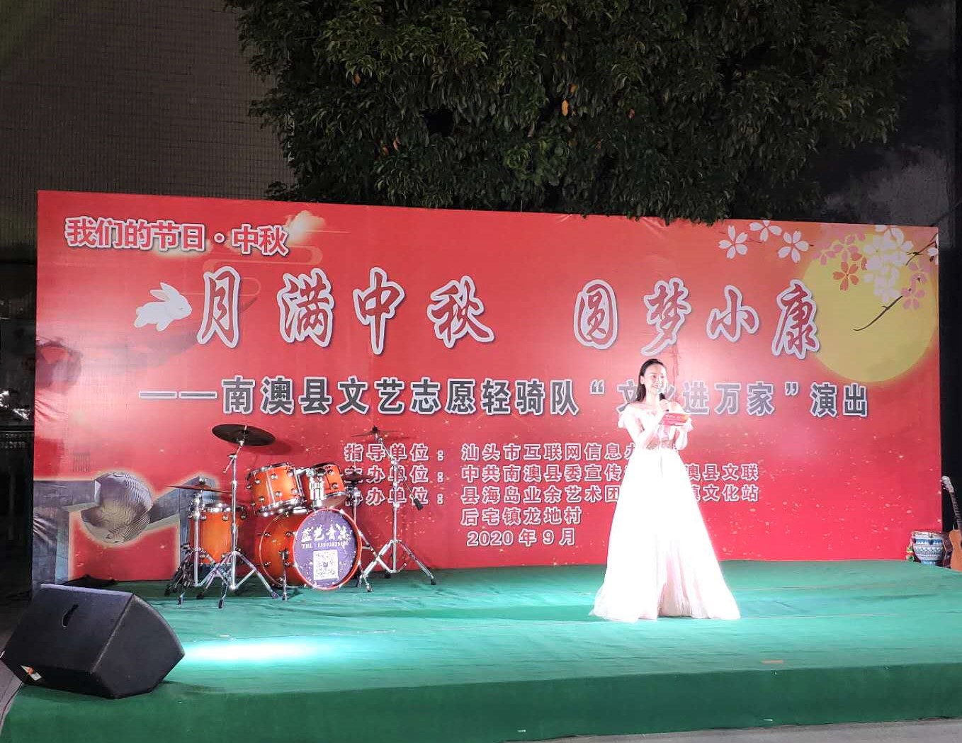 9月29日晚,由汕头市互联网信息办公室指导,中共南澳县委宣传部、县文联主办,县海岛业余艺术团、后宅镇文化站、网易潮汕协办的“月满中秋 圆梦小康”——南澳县文艺志愿轻骑队“文化进万家”演出活动在后宅镇龙地渔村举行。县委常委、宣传部长黄淑华与龙地村村民观看了文艺演出。