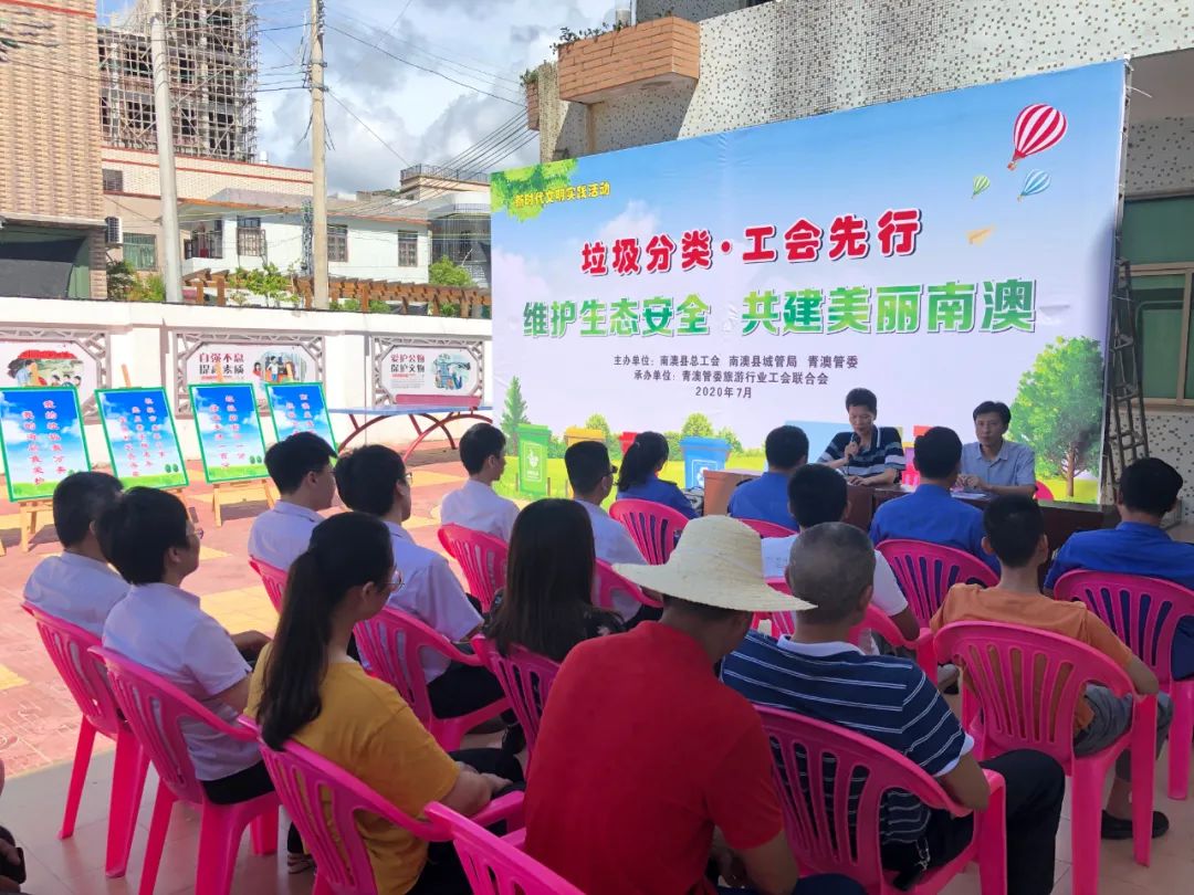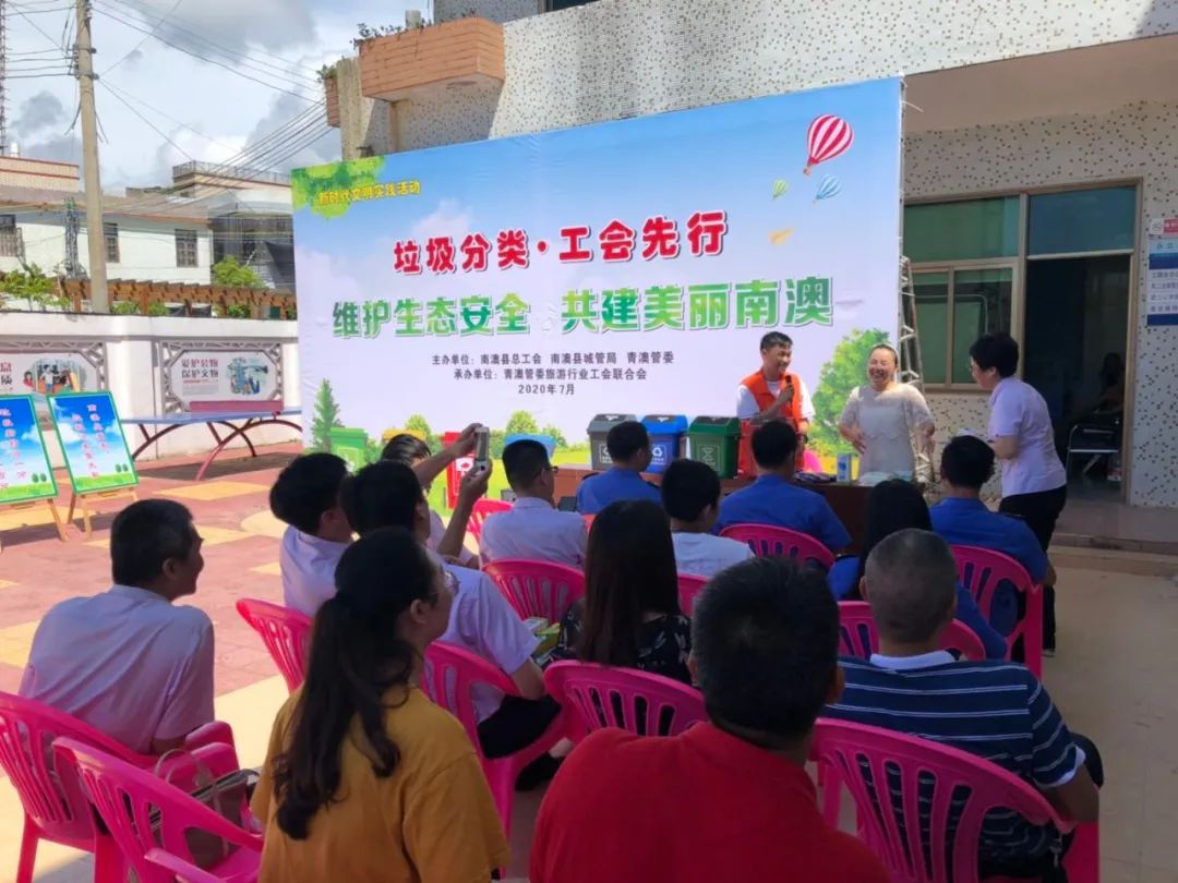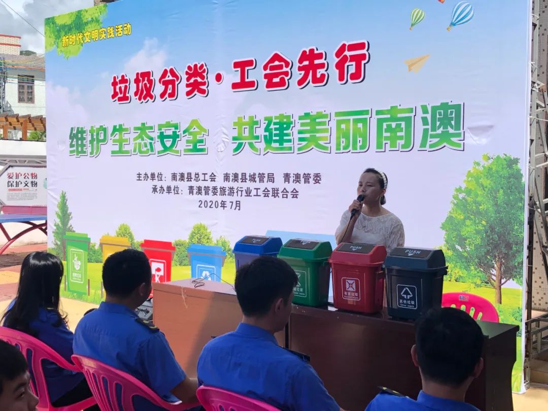 7月20日上午,县总工会联合县城管局、青澳管委,在青澳管委旅游行业工联会开展“维护生态安全、共建美丽南澳”垃圾分类宣传活动。活动由县总工会副主席吴强生同志主持,青澳管委副书记、工会主席柯文雄同志参加活动。活动现场布置了垃圾分类的宣传展板和宣传栏,图文并茂地向大家展示垃圾分类知识。 活动中,垃圾分类的讲解员还为现场的职工群众讲解了垃圾分类的小常识,通过将垃圾分类的卡片,模拟投放到四个不同颜色的垃圾桶,向大家展示如何进行垃圾分类,分类后如何处理垃圾分类知识。 活动中还开展了垃圾分类答题环节,通过垃圾分类小常识,促进职工群众对垃圾分类知识的了解,增强环保意识。通过此次垃圾分类宣传活动,进一步增进职工群众对垃圾分类工作重要性的认识,让“绿色、低碳、环保”理念深入人心,从做好垃圾分类处理这件具体的事件上做起,一起践行文明健康生活方式,建设美丽生态南澳,共创文明城市。