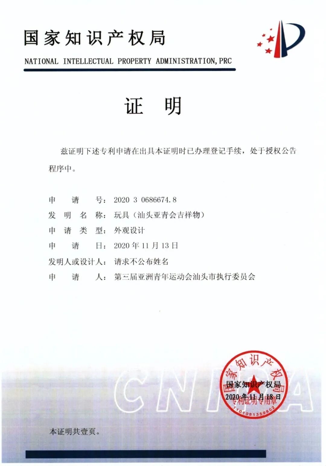 随着第三届亚洲青年运动会倒计时一周年关键节点的临近,亚青会的知识产权保护工作也在周密部署中。近日,亚青会汕头市执委会得到国家知识产权局的大力支持,在中国汕头(玩具)知识产权快速维权中心的协助下,开辟绿色审批通道进行快速审查,在最短期限内获得授权证明书,确保了吉祥物在正式公开前获得专利保护。