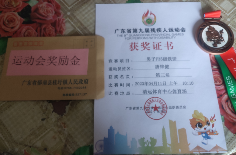 前段时间,广东省第九届残疾人运动会在清远市举行,郁南县桂圩镇桂连村委格塘自然村的运动员唐锌健,在男子F35级铁饼项目中突破自我,取得了第三名,为云浮市代表团摘得一枚宝贵的奖牌。