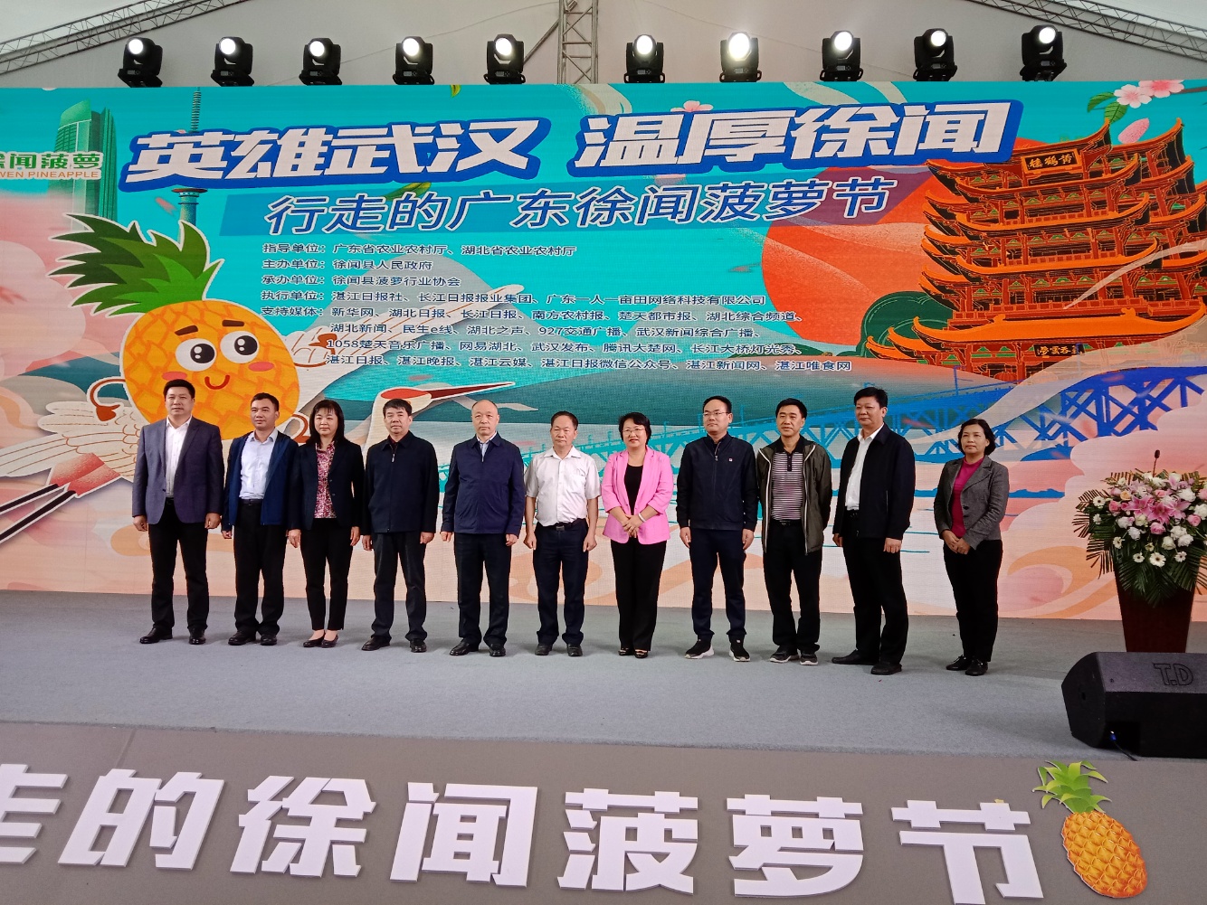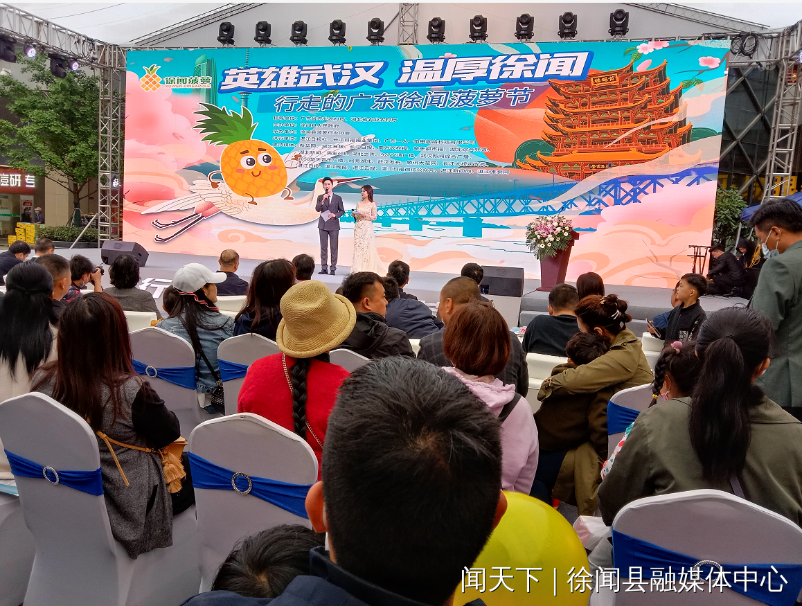 徐闻融媒讯 4月24日下午3:30,“英雄武汉,温厚徐闻——行走的广东徐闻菠萝节”在武汉光谷广场举行。湖北省农业农村厅党组成员、副厅长刘长华,广东省农业农村厅总农艺师郑宏宣,县长罗红霞,县人大常委会党组书记、主任李逸,县委常委、常务副县长陈光力,县委常委、县委办主任杜法光,县人大常委会副主任董红莲,县政协副主席陈北跑,县政府办、农业农村局等部门领导参加了活动。