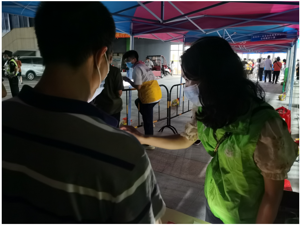 从早上8点开始,环保志愿者们分别在城东广场分流登记、在体育中心疫苗接种点预检登记区、候诊区、接种区等各个点位有秩序地引导市民进行排队进场、测温扫码。