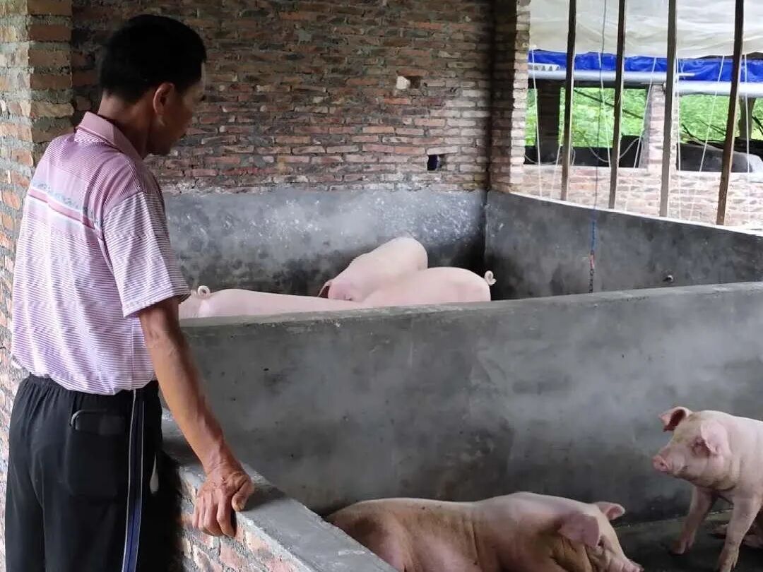 脱贫户邱永红正在观察扶贫猪的生长。(来源:四会市迳口镇人民政府供图)