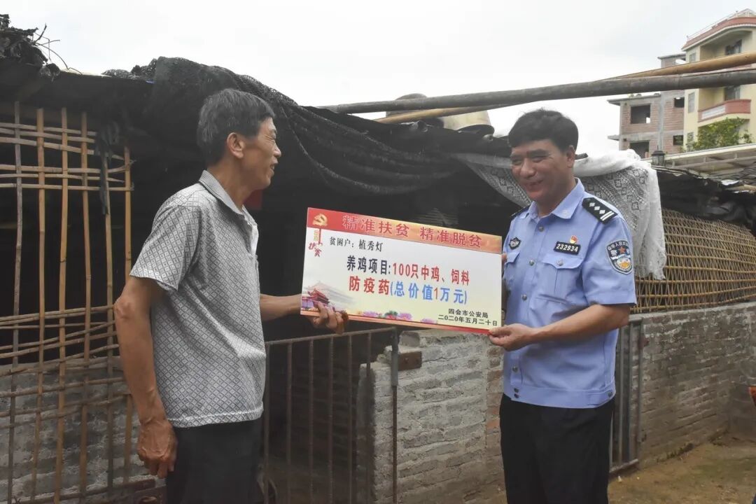 四会市公安局和四会市驻永固镇扶贫工作组通过多次走访摸底、沟通交流,了解到植秀灯户目前的家庭困难后,便迅速研究制定方案,共出资10000元为他们购置了100只鸡苗、鸡饲料等。