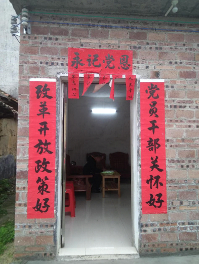 贫困户手写悬挂“永记党恩”对联。(来源:四会市委组织部供图)