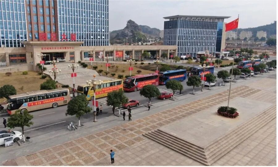 整洁的富川民族文化广场大道两旁,整齐排列着24辆返粤大巴车,这是最后一批免费接送贫困劳动力返粤复工的专车,等候测温上车的每个人都佩戴口罩,虽看不清脸,但每个人的眼里都流露着喜悦感恩之情。