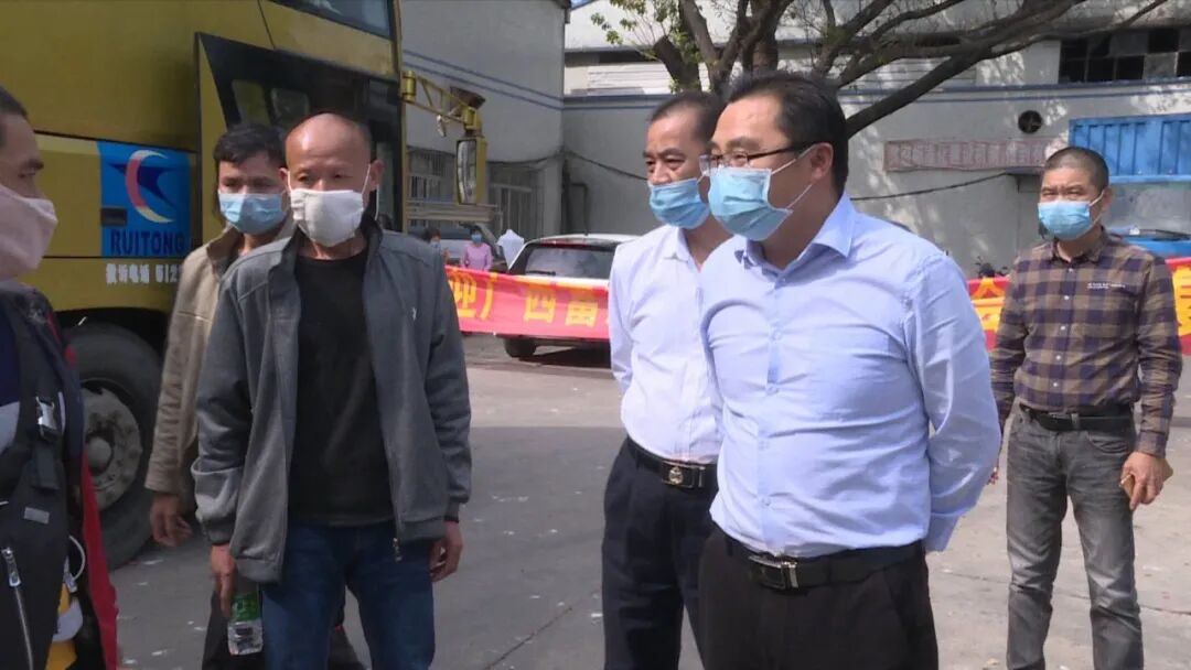 历经5小时车程,当日下午3点两辆载有四会市35名富川籍民工的大巴车顺利抵达四会市金叶纺织染整有限公司厂区内。相隔一个多月,他们再次回到了这个熟悉的工厂大家庭。