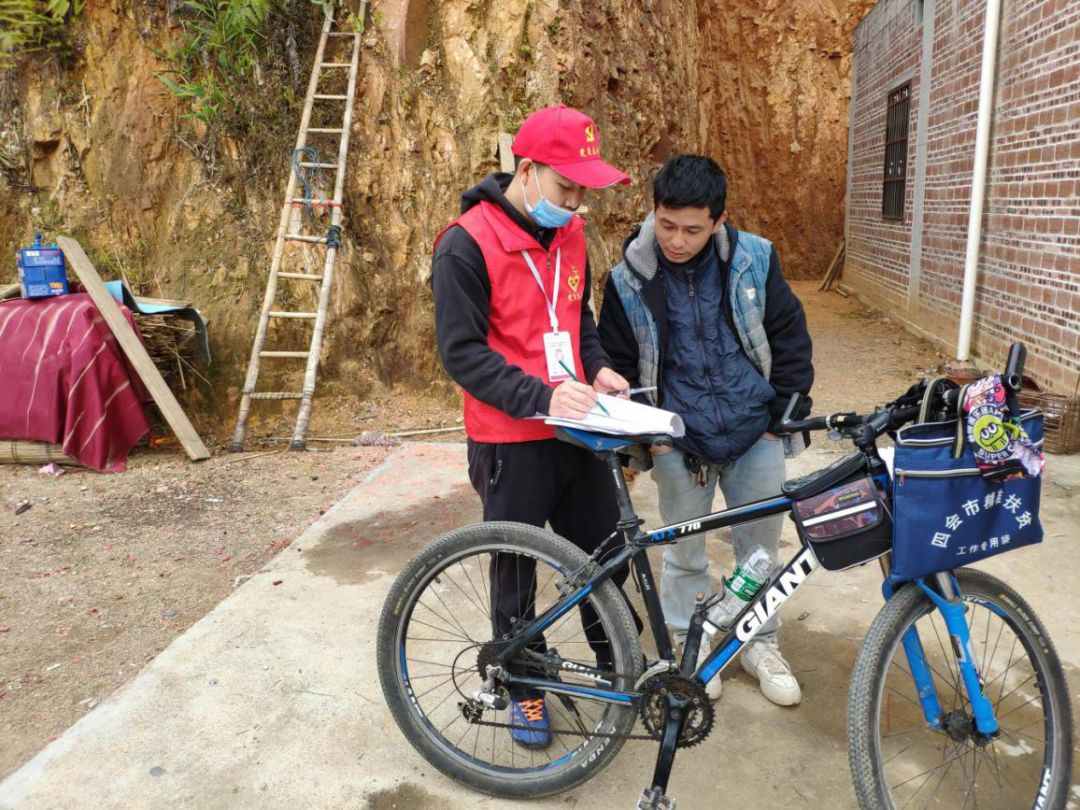 宣传防控知识;劝阻村民聚会;协助道路管制、筛查进出车辆;摸排返乡人员、核查防疫情况,全面落实疫情防控工作,并深入贫困户家中了解他们的粮食保障,穿衣保暖等情况。通过全面排查和跟踪发现,在11个对口帮扶的村中共有3名常住贫困村民曾离开肇庆地区,按照当地规定落实了管控措施。 工作组成员骑车走村入户宣传防疫知识,了解贫困户的粮食保障,穿衣保暖等情况。(来源:四会市驻怀集县永固镇扶贫工作组供图)