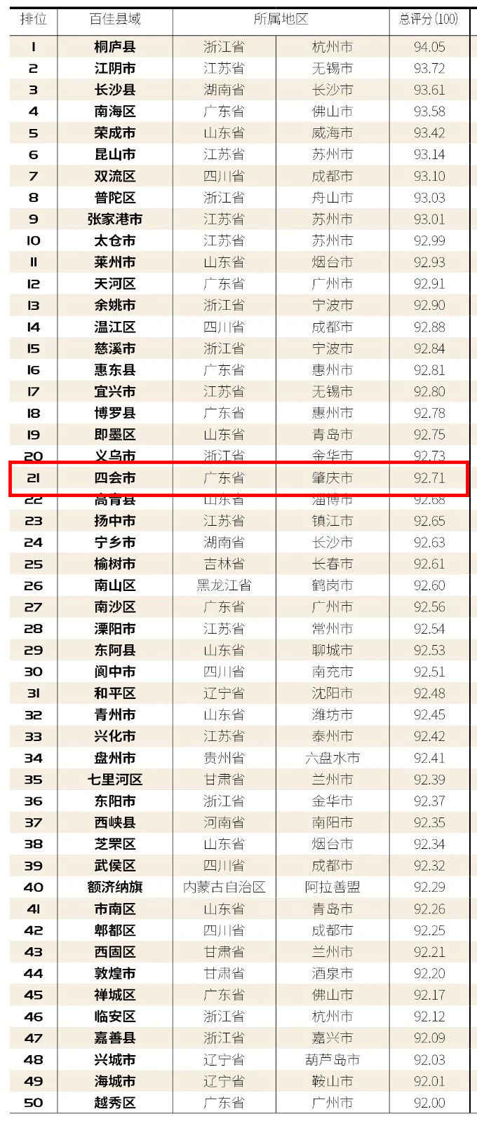 在2020年9月发布的“2020中国最具幸福感百佳县市”榜单中,四会在全国排名21!