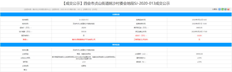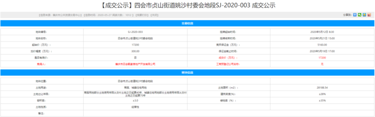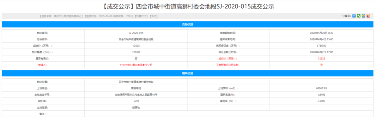 2020年5月21日,肇庆市四会聚豪房地产开发有限公司以1.72亿元成功拿下位于贞山街道姚沙村委会地段贞山宾馆对面42.28亩的一块商住用地,折合楼面地价2034元/平方米;2020年6月1日,肇庆东原毅腾房地产开发有限公司经过11轮竞价,最终以3.32亿元夺得四会市体育馆对面59.92亩的商住用地,溢价5000万元,折合楼面地价2770元/平方米;2020年6月4日,广东中宏汇置业有限责任公司以1.2525亿元成功拿下位于城中街道高狮村委会地段城中街道办旁102.1亩的一块商服用地。短短一个月时间不到,四会便揽金约6.3亿元,由此可见,土拍市场还是比较活跃的。