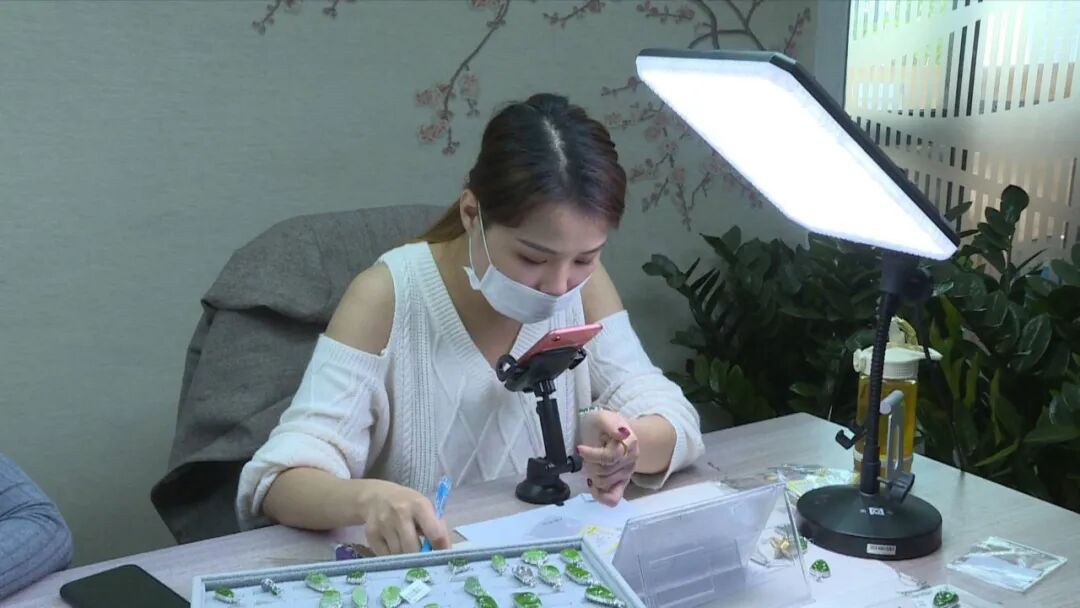 “耳饰代表一生一世聆听爱的心声,这对带荧光的耳环很适合作为定情信物。”正在镜头前卖力推荐货品的欣阳是石力派公司旗下的一名主播,今年刚25岁的她已经旅居过上海、云南、缅甸等多个地方,最终她选择留在四会成为一名玉器主播。