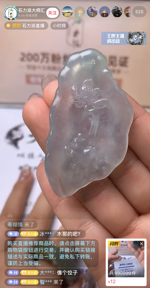 凌晨1:15,四会市“石力派翡翠”的抖音直播间里仍然热火朝天,女主播正在镜头前一边用游标卡尺度量着翡翠佛雕的厚度,一边介绍着佛雕的寓意。直播间底下的弹幕不断弹出,议论着货品的做工和质地。