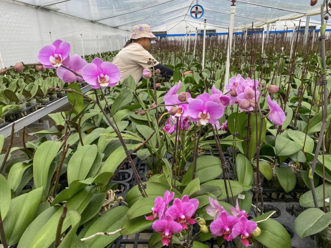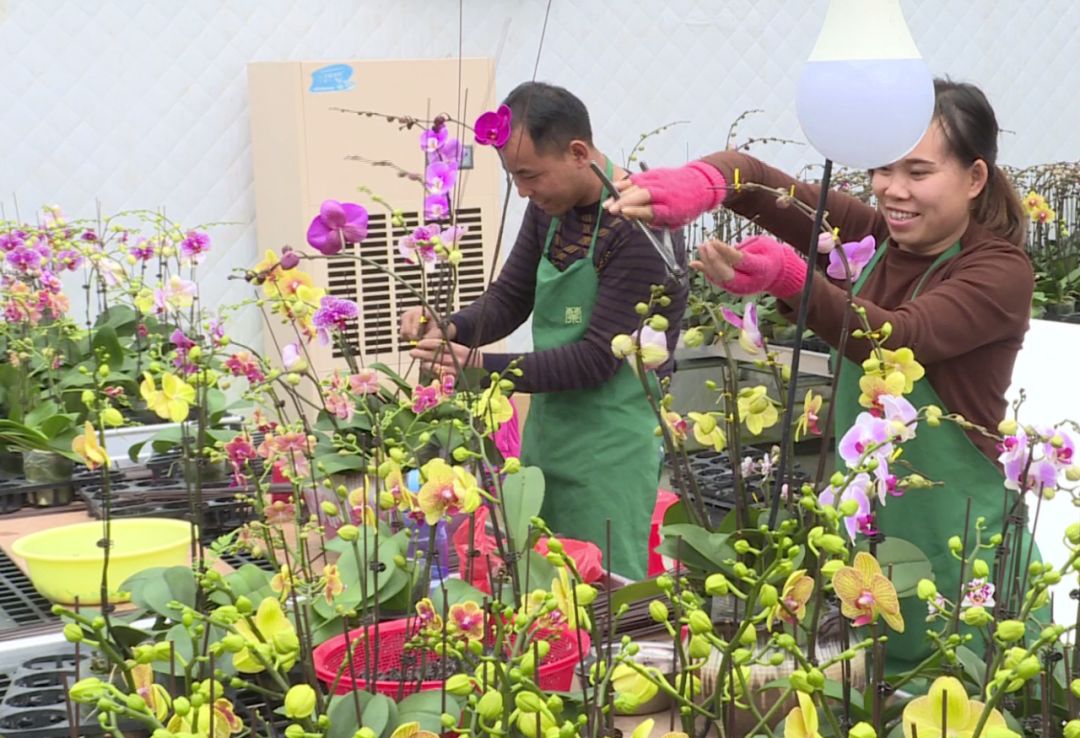 智慧兰花种植基地温室大棚内工人在修剪兰花。(来源:西江日报供图)