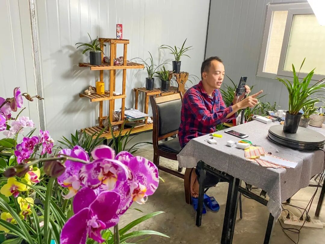 工作人员通过直播平台售卖兰花。(来源:西江日报供图)