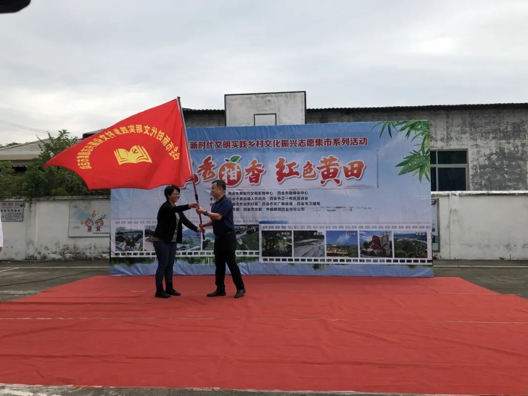 活动最后,现场进行了授旗交接仪式,第十场乡村文化振兴志愿集市活动举办地大沙镇的有关负责同志接过了授旗。