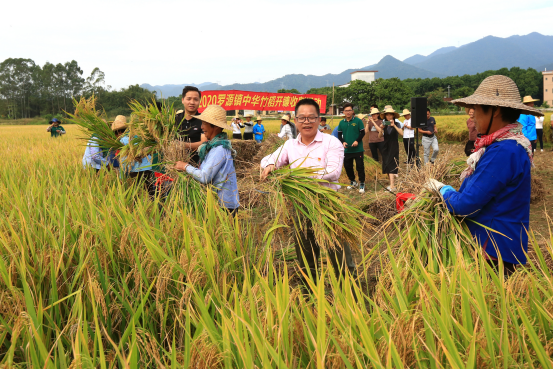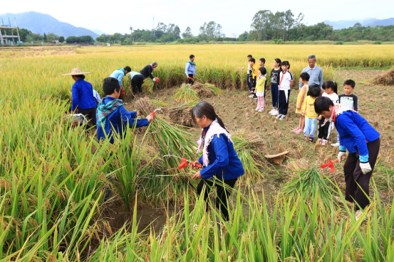 “中华竹稻”开镰收割亲子体验活动。(来源:四会市罗源镇人民政府供图)