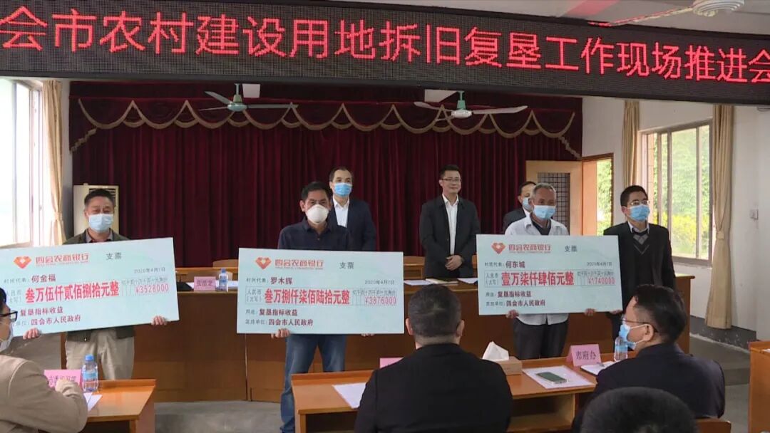 期间,四会市领导为四会市首批拆旧复垦收益人代表颁发指标成交价款支票。